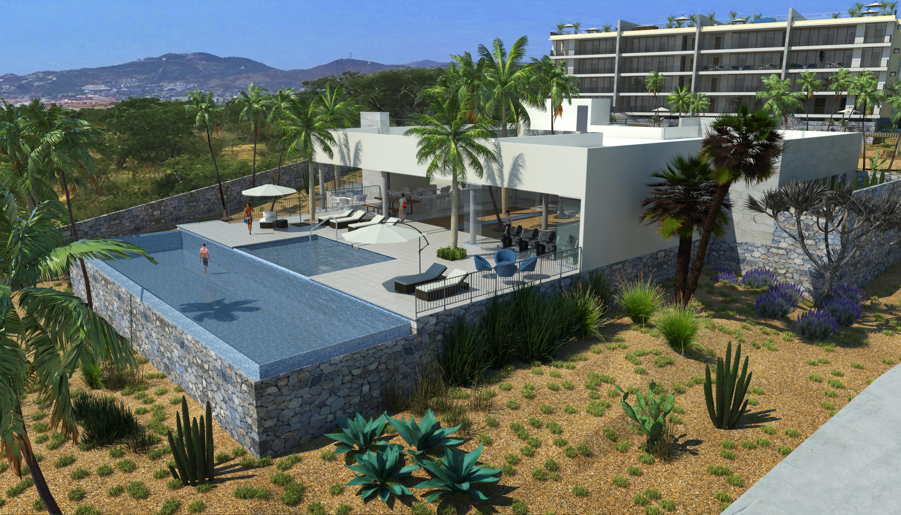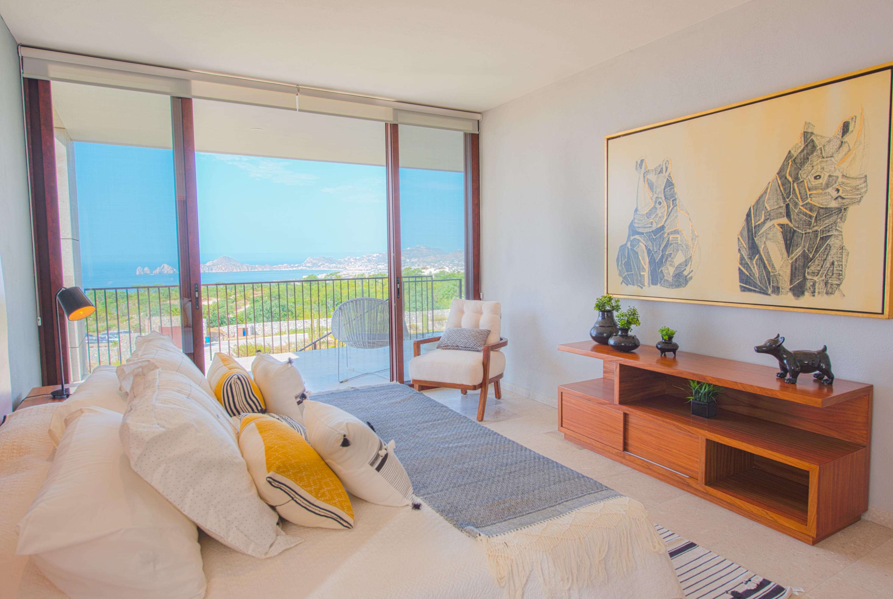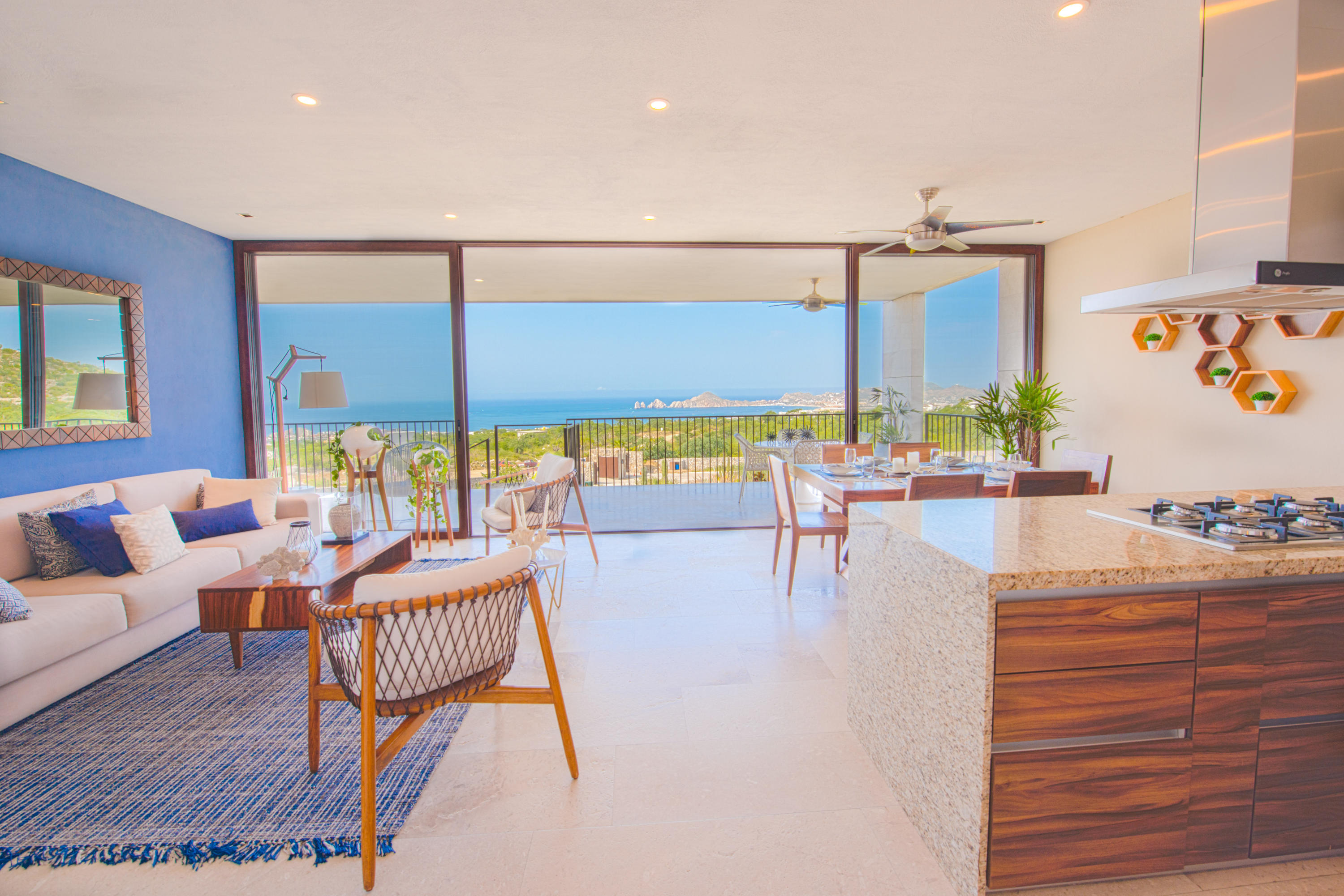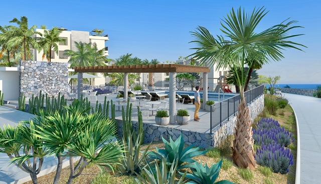 Solaria is a unique, high end condominium development in Cabo San Lucas with a stunning panoramic view of the Arch, the Pacific ocean and the Sea of Cortez. The design and topography of this gated 7.5 acre parcel ensures permanent views for all levels. With all-inclusive services, onsite concierge, and rental/property management, these condos come with every convenience. This 1 Bed/2 Bath Ground Floor Ocean View condo with a private garden has beautiful granite and marble travertine finishes. All units come fully equipped with GE High-Profile appliances, personal storage unit. This low density pet friendly development offers elevators, underground parking, Tennis (PickleBall) court, kid’s play area with a separate pool, covered common area with grilling and dining locations. The community