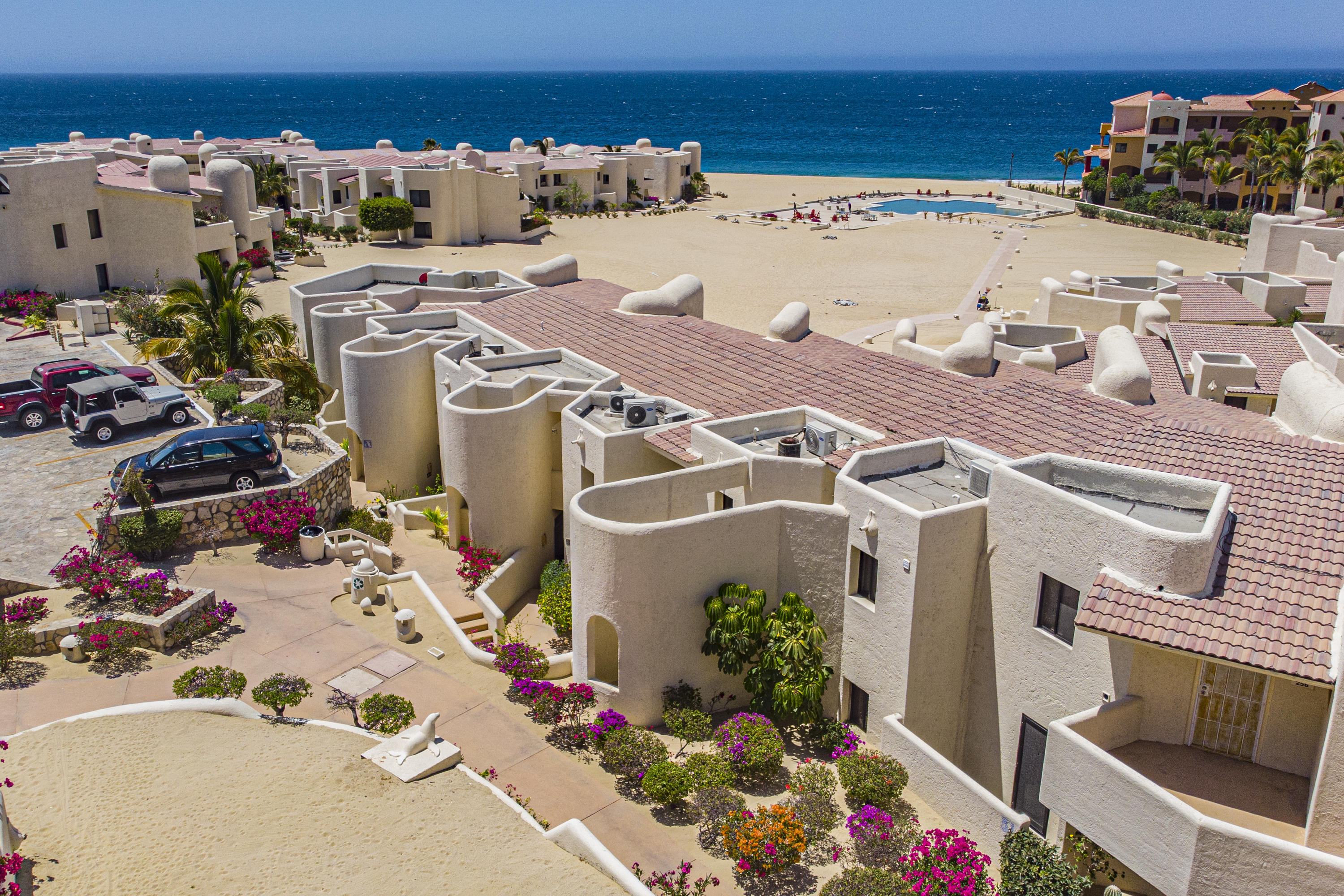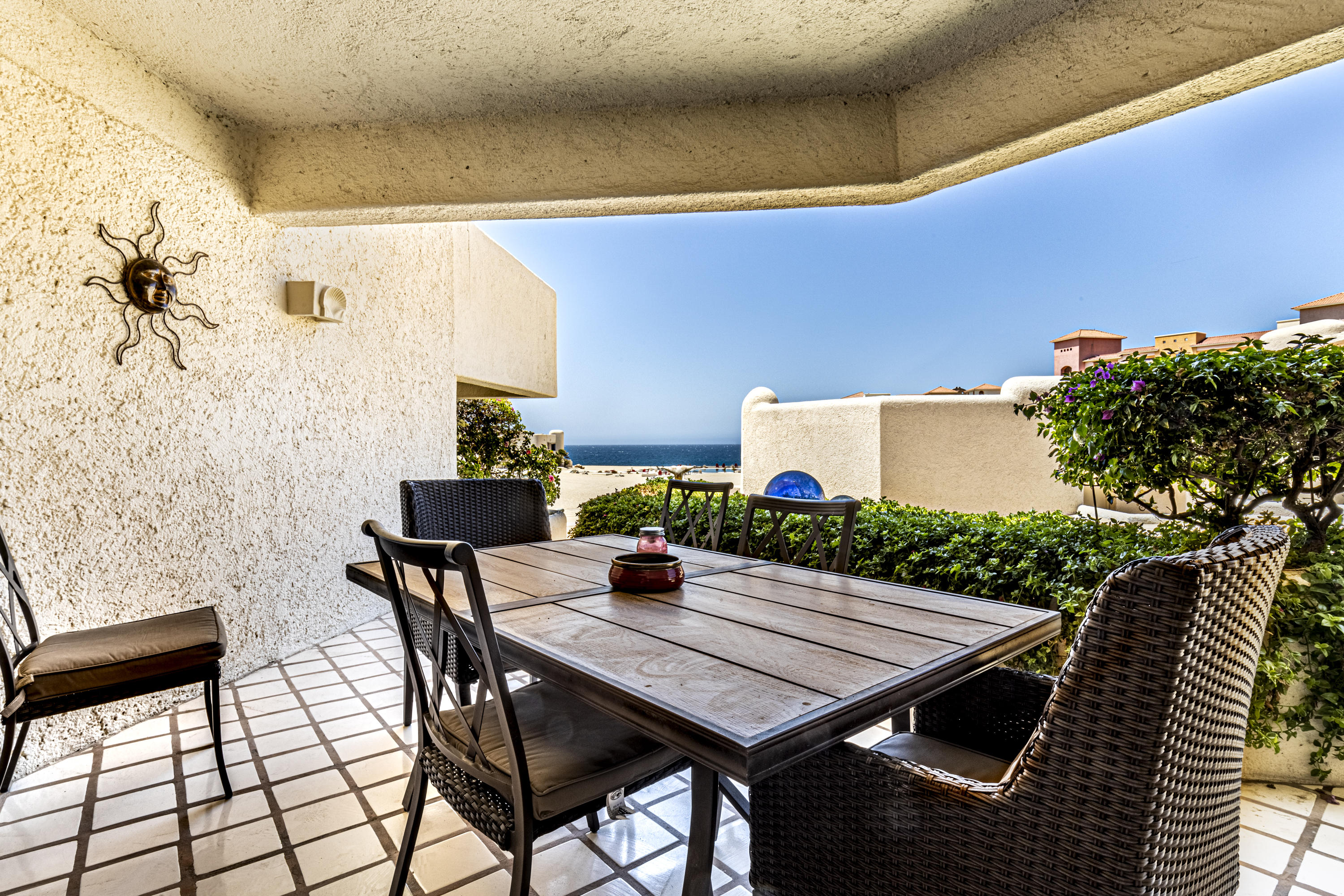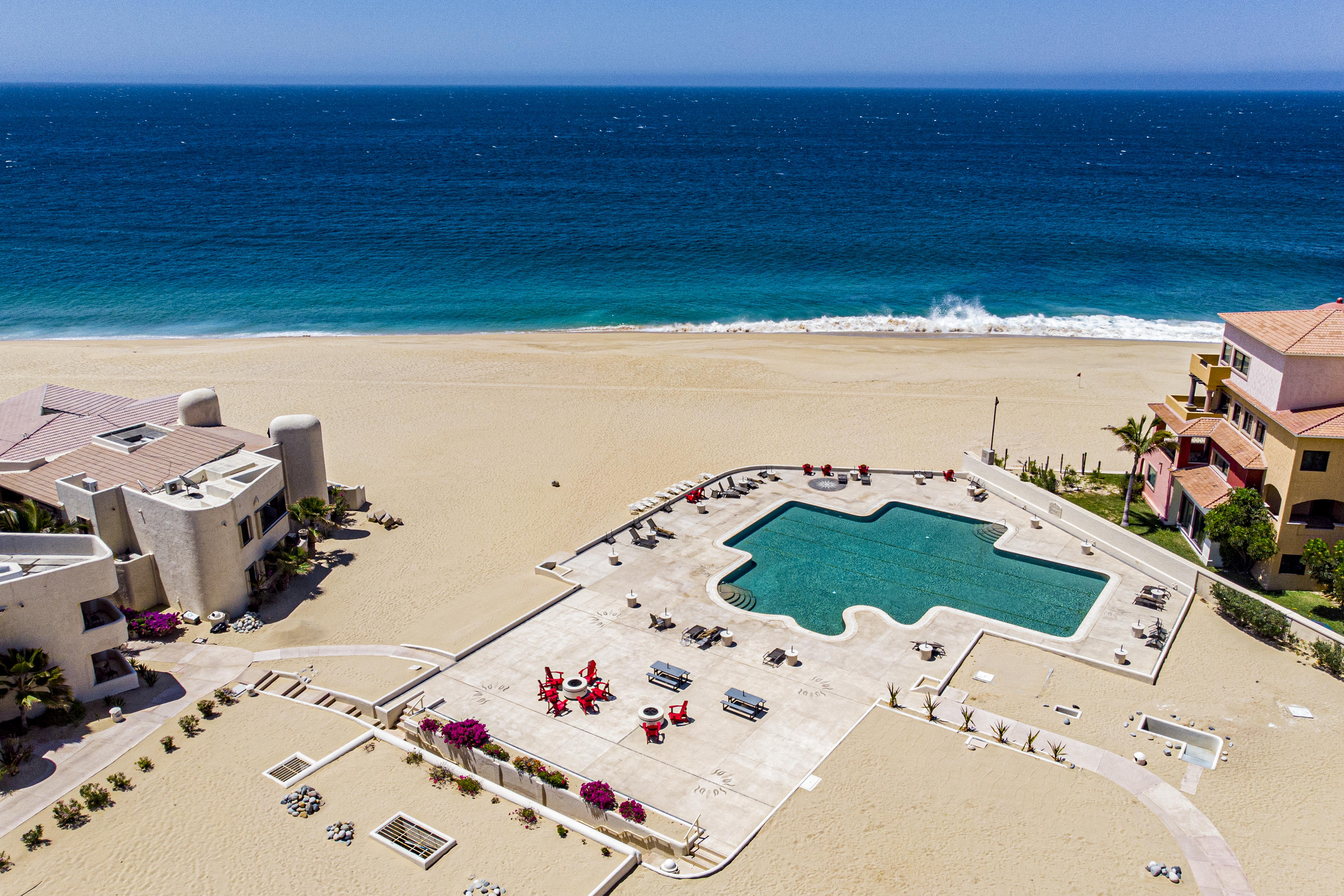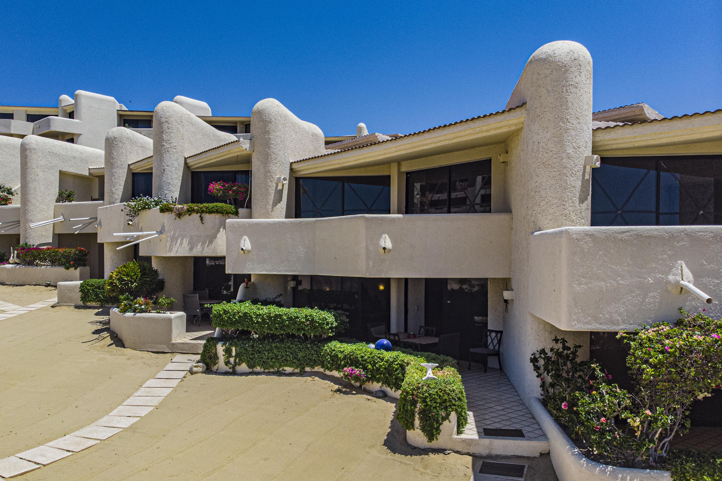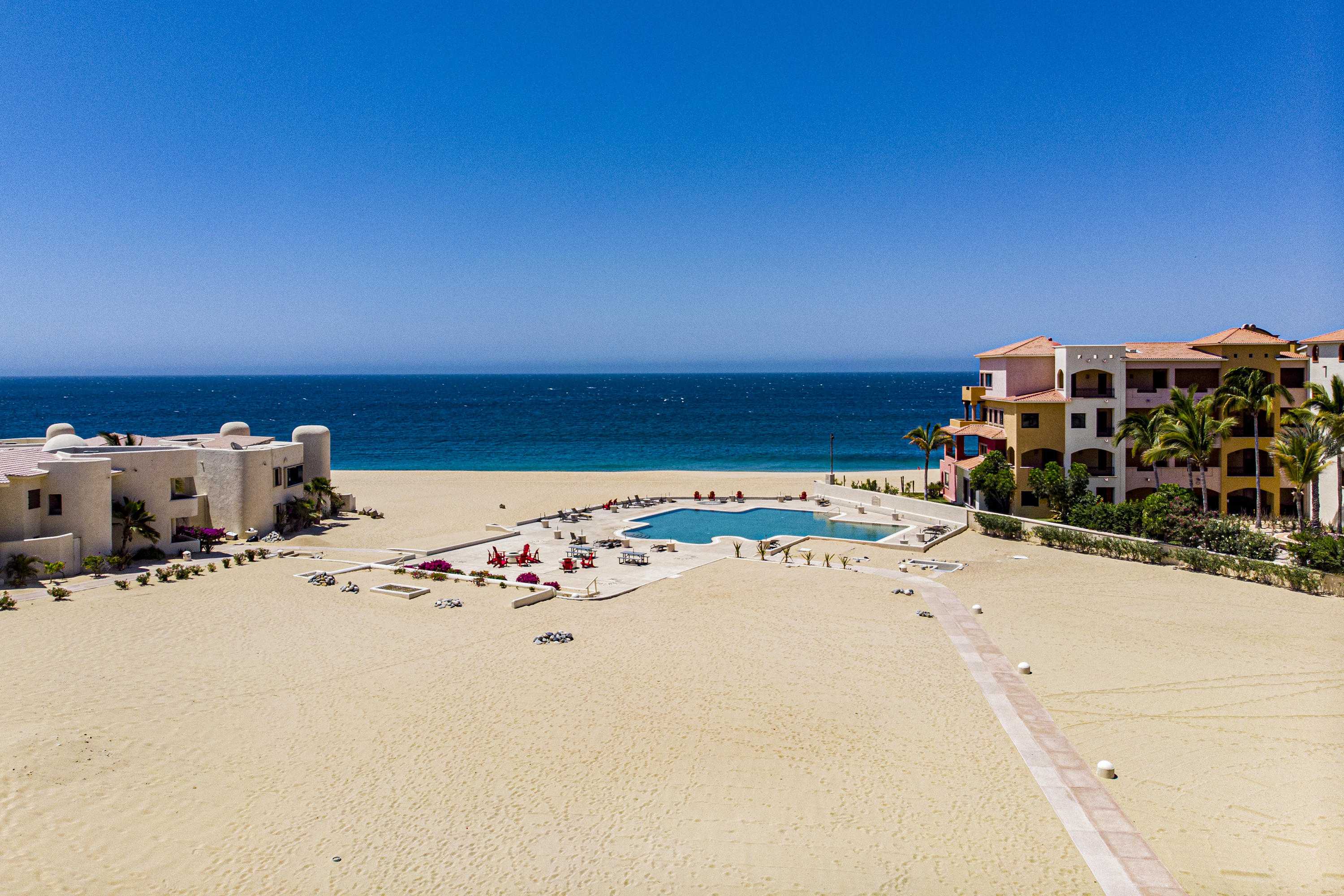 Walk on to the beach from your safe, secure, affordable luxury, one level beach condo, coffee in hand. WAKE UP to an OCEAN VIEW! Open kitchen featuring granite tops, & new stainless appliances. 2 bdrm-2 bath. Walk off your private deck from your living room, or master bdrm. Built on one of the most beautiful and pristine 1 mile stretches of beach at the very tip of Baja Sur, where the Pacific meets the Sea of Cortez. GREAT ROI! An easy access, first floor unit, opening on to beach, convenient parking and a short walk to the marina, restaurants and town. 2 ocean front pools, 1 with Swim-up palapa bar. Wired for automatic sound, light, air cond, TV, & auto door lock as u enter unit. Fully automated; front door panel controls everything on and off from the touch of a switch.