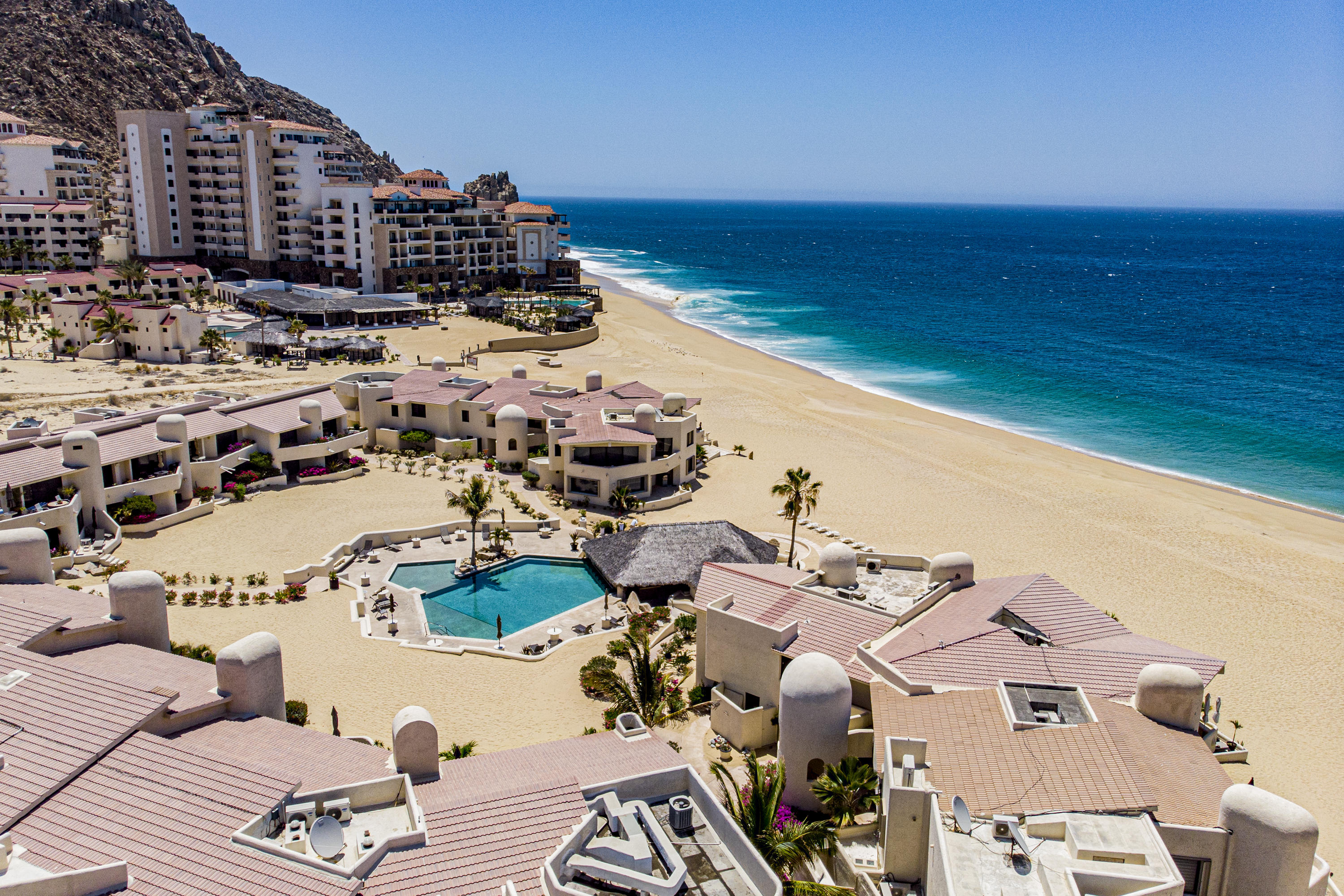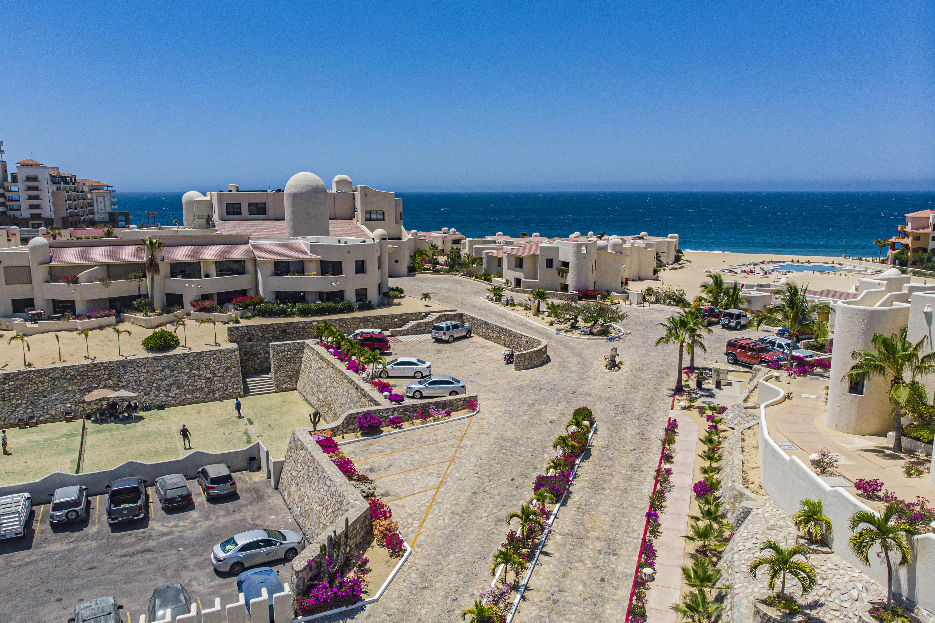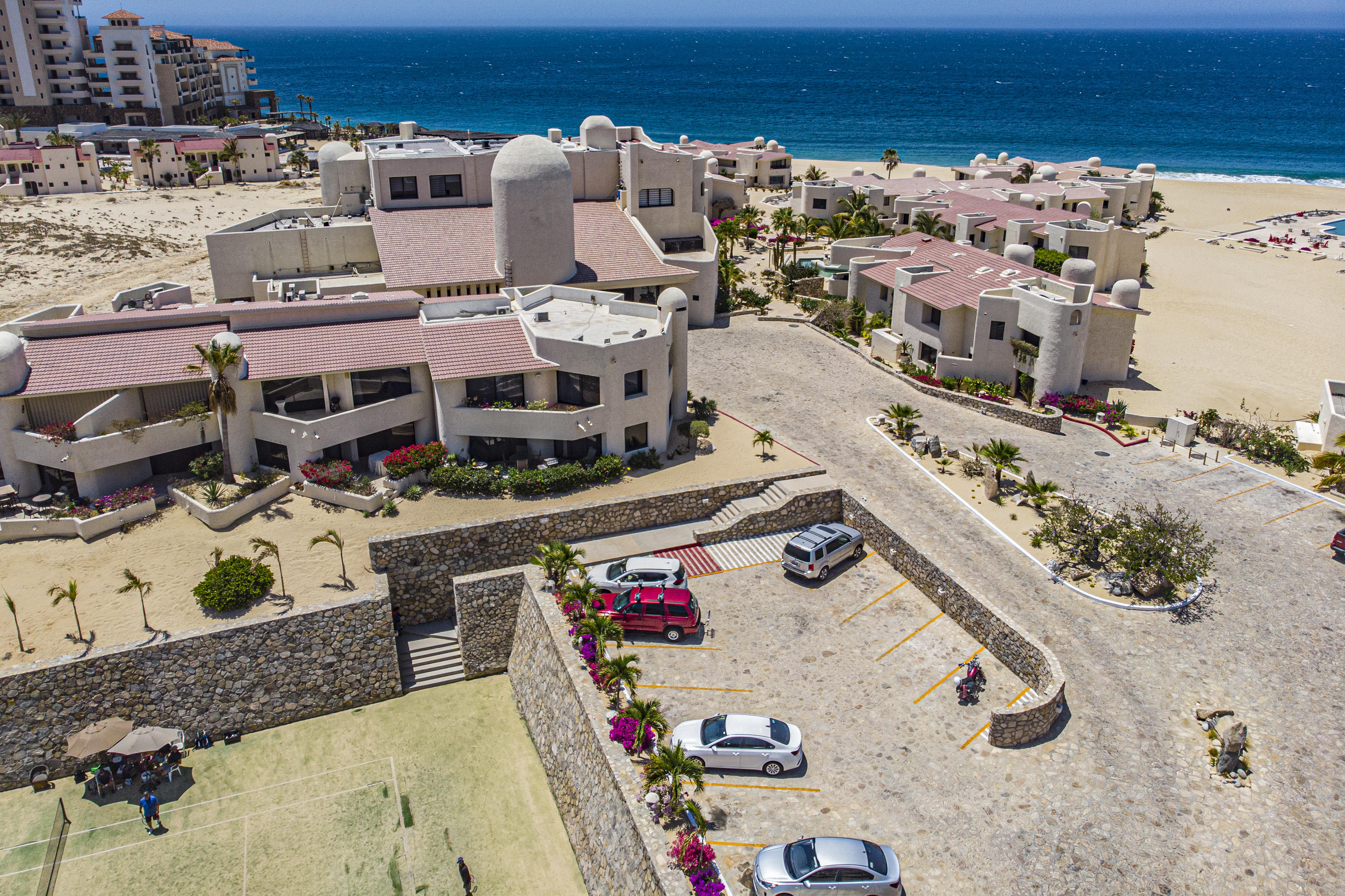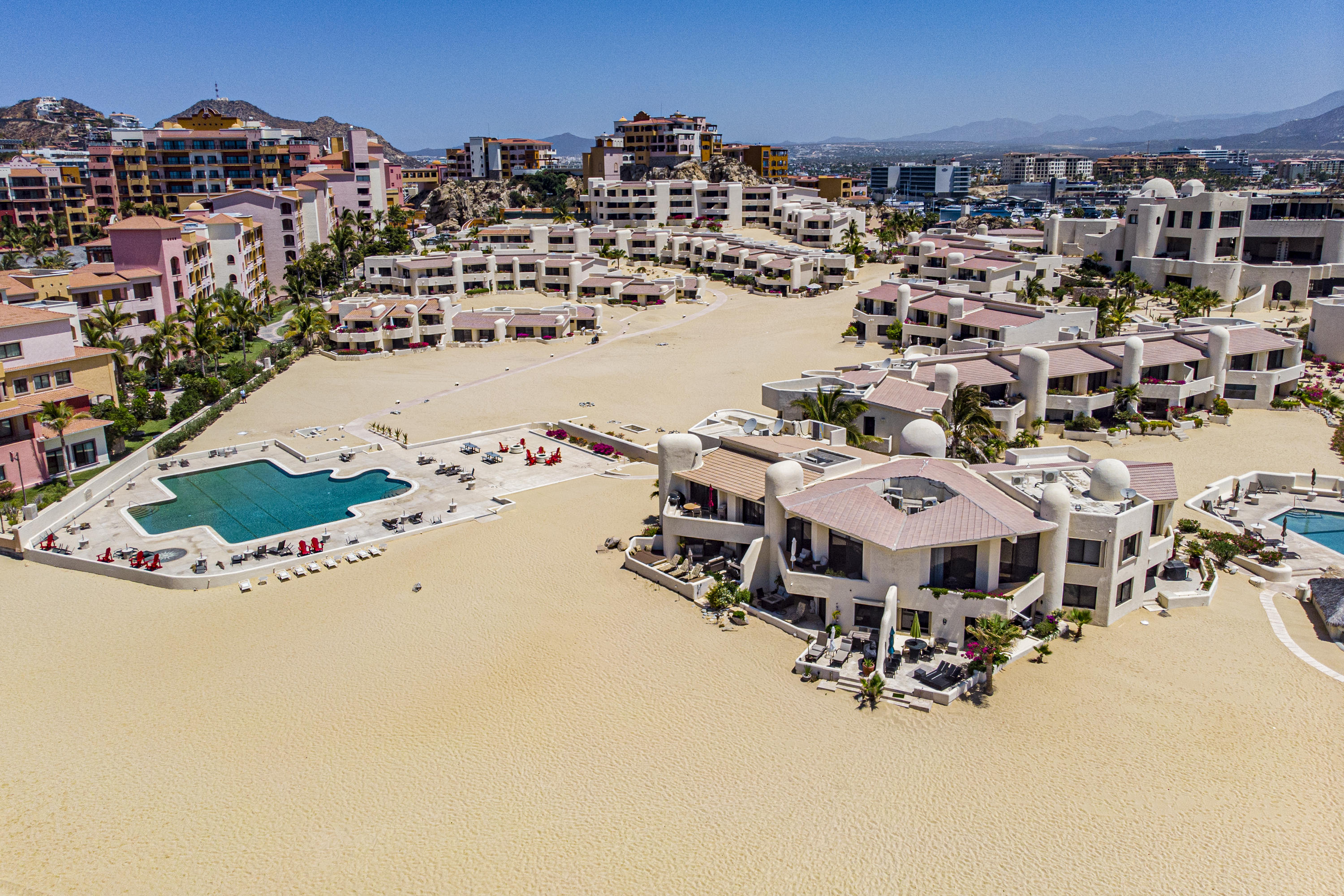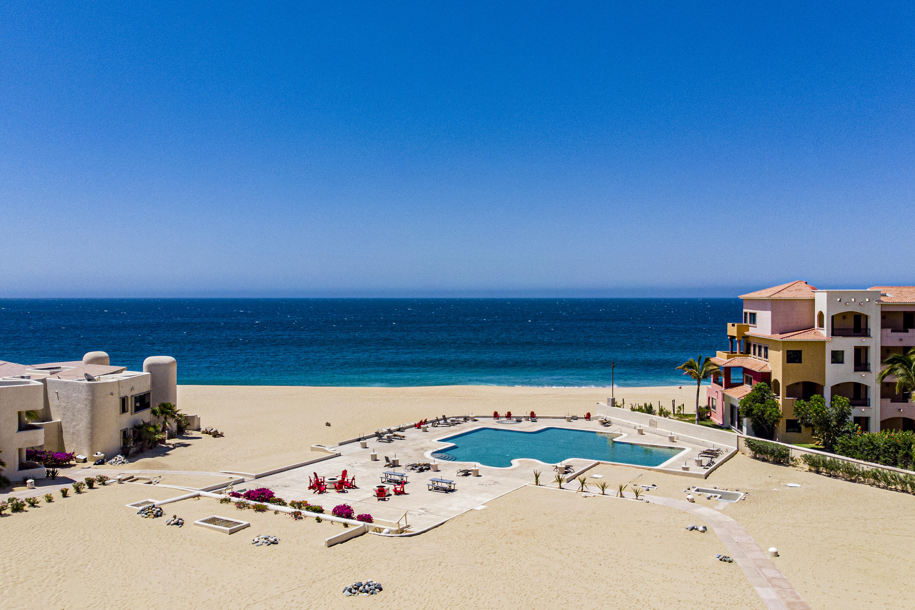 Walk on to the beach from your safe, secure, affordable luxury, one level beach condo, coffee in hand. WAKE UP to an OCEAN VIEW! Open kitchen featuring granite tops, & new stainless appliances. 2 bdrm-2 bath. Walk off your private deck from your living room, or master bdrm. Built on one of the most beautiful and pristine 1 mile stretches of beach at the very tip of Baja Sur, where the Pacific meets the Sea of Cortez. GREAT ROI! An easy access, first floor unit, opening on to beach, convenient parking and a short walk to the marina, restaurants and town. 2 ocean front pools, 1 with Swim-up palapa bar. Wired for automatic sound, light, air cond, TV, & auto door lock as u enter unit. Fully automated; front door panel controls everything on and off from the touch of a switch.