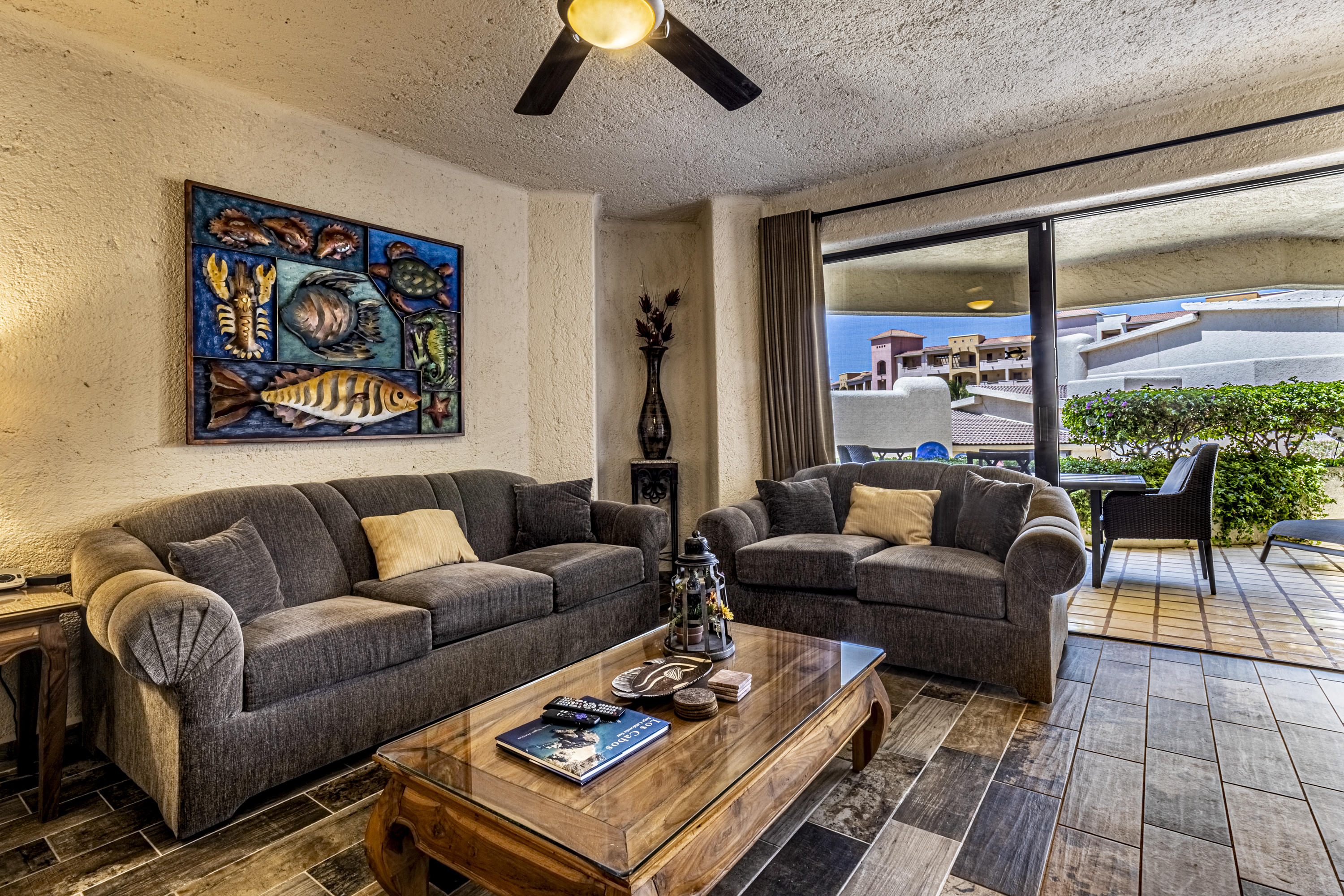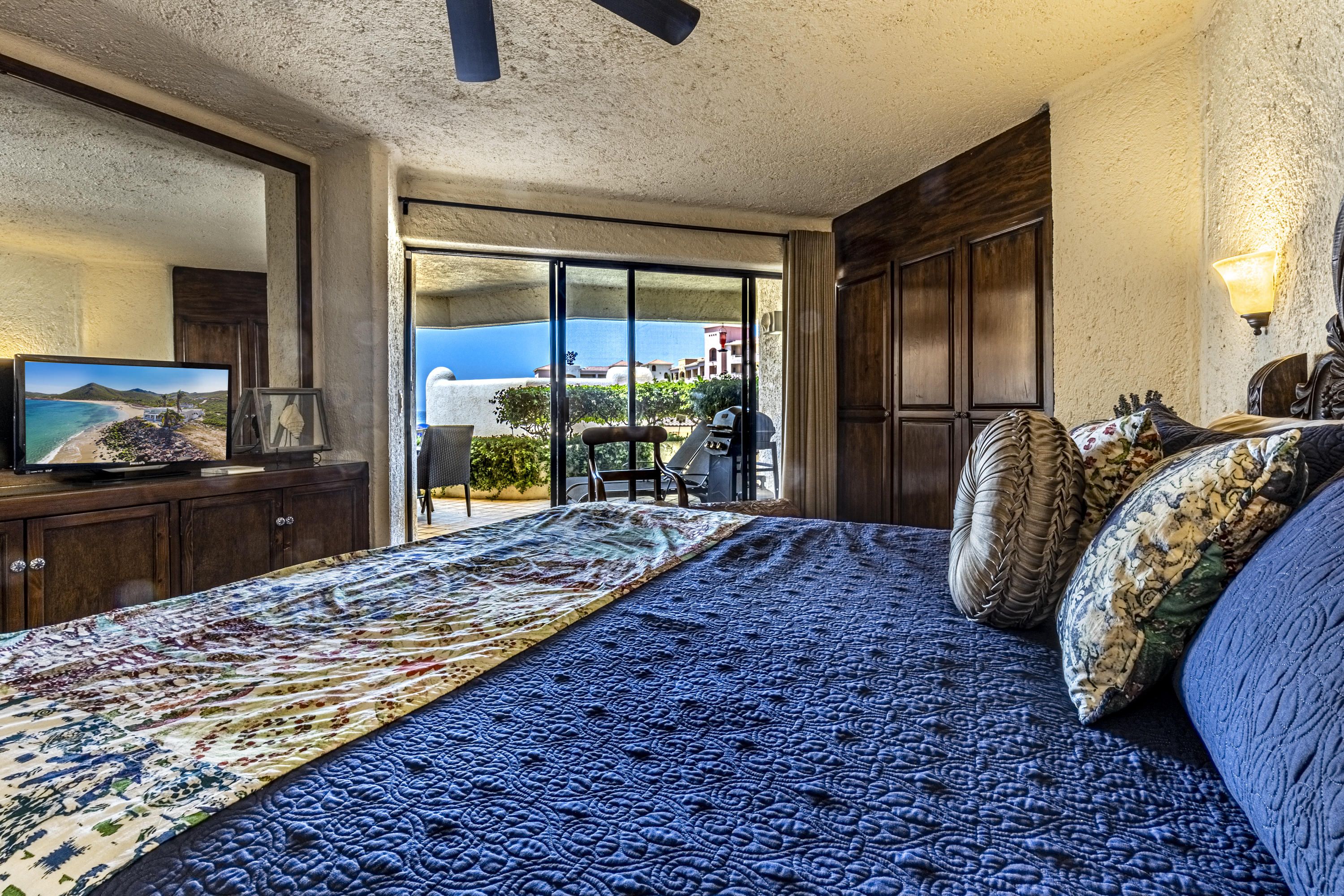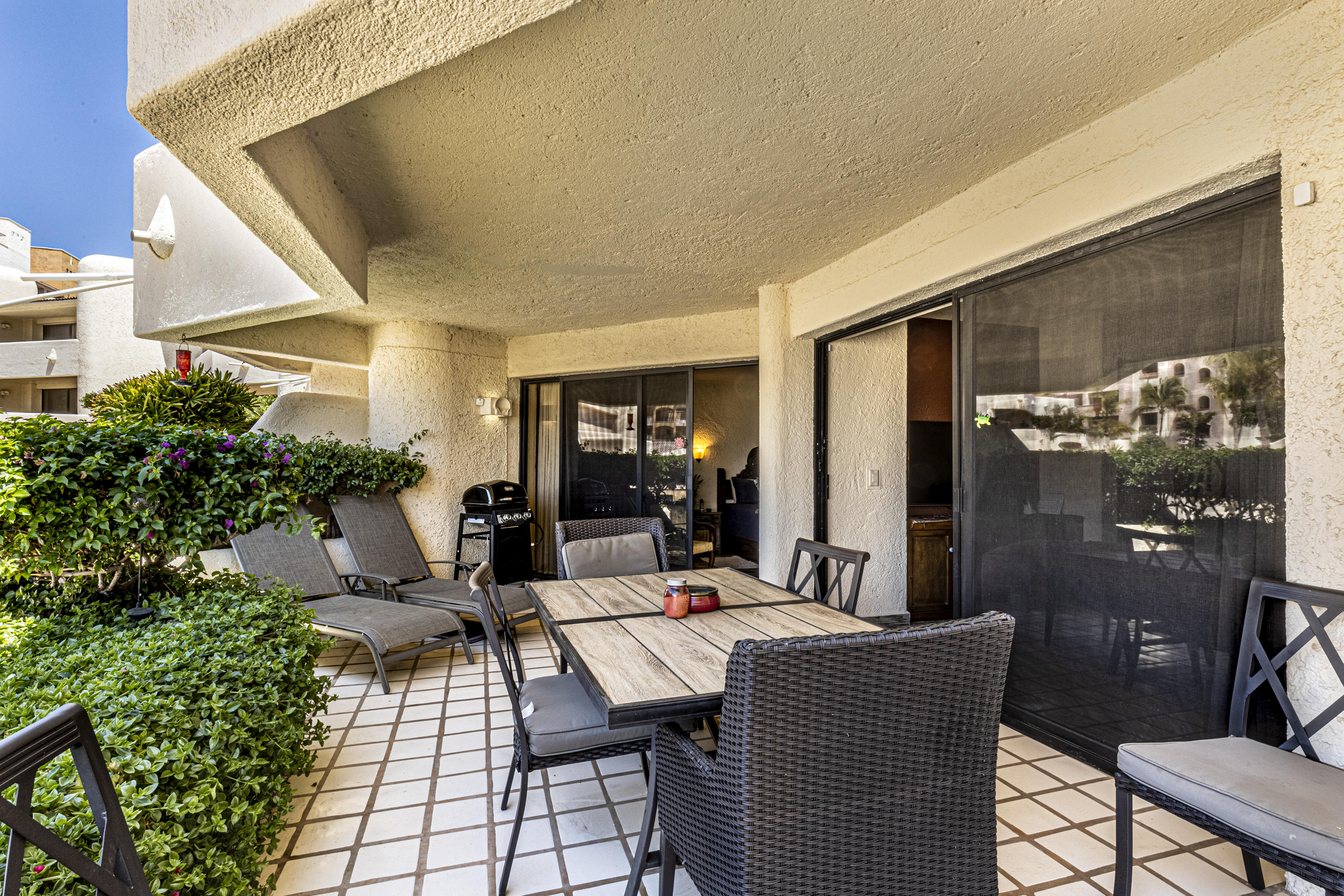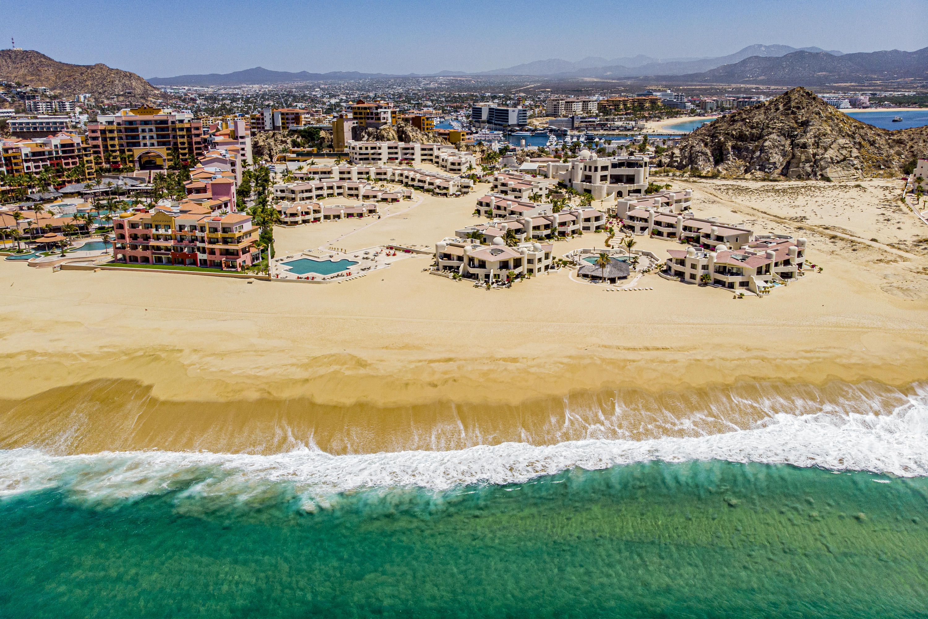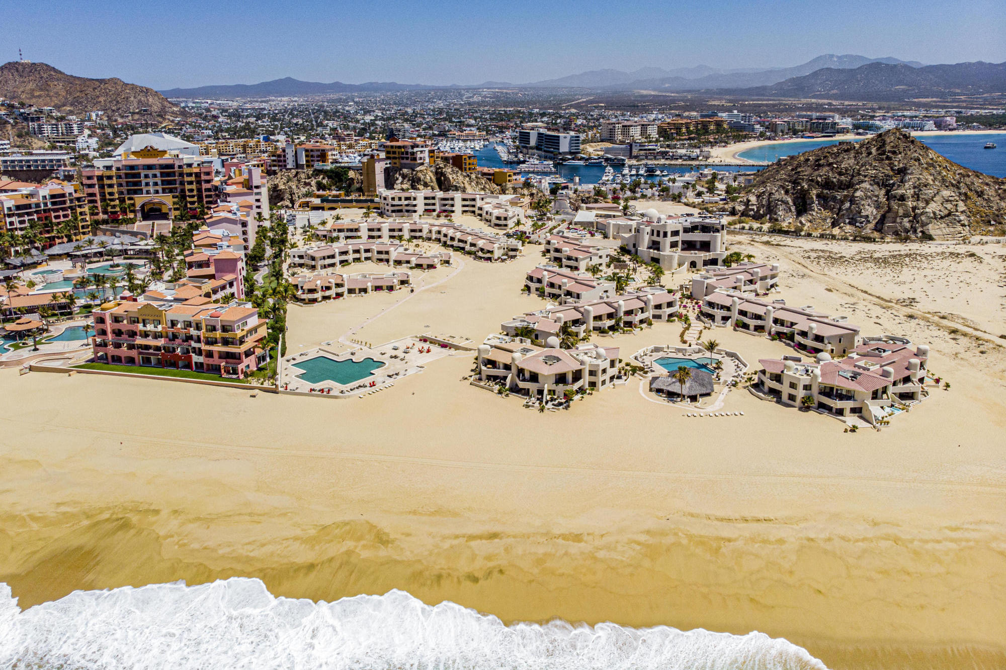 Walk on to the beach from your safe, secure, affordable luxury, one level beach condo, coffee in hand. WAKE UP to an OCEAN VIEW! Open kitchen featuring granite tops, & new stainless appliances. 2 bdrm-2 bath. Walk off your private deck from your living room, or master bdrm. Built on one of the most beautiful and pristine 1 mile stretches of beach at the very tip of Baja Sur, where the Pacific meets the Sea of Cortez. GREAT ROI! An easy access, first floor unit, opening on to beach, convenient parking and a short walk to the marina, restaurants and town. 2 ocean front pools, 1 with Swim-up palapa bar. Wired for automatic sound, light, air cond, TV, & auto door lock as u enter unit. Fully automated; front door panel controls everything on and off from the touch of a switch.