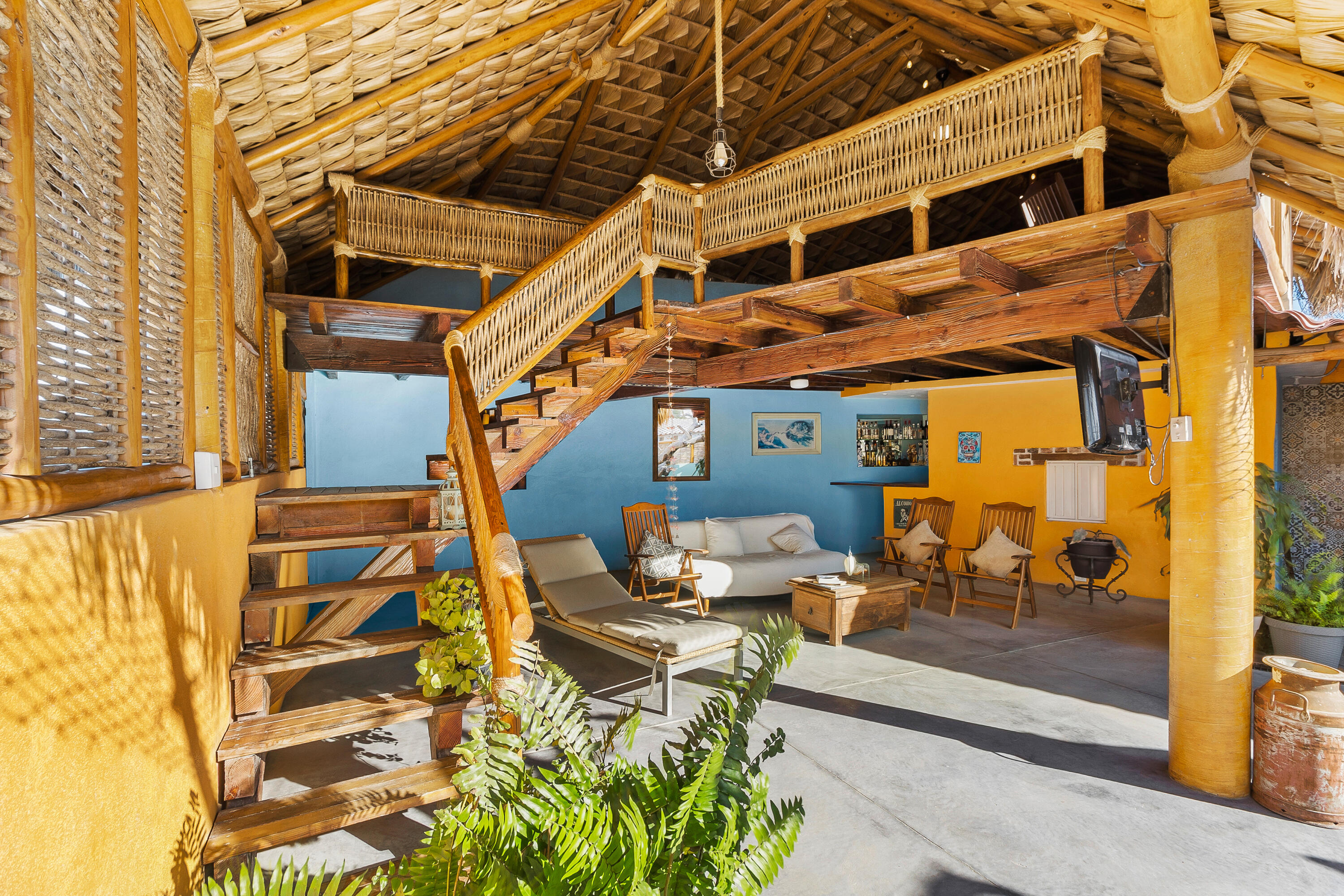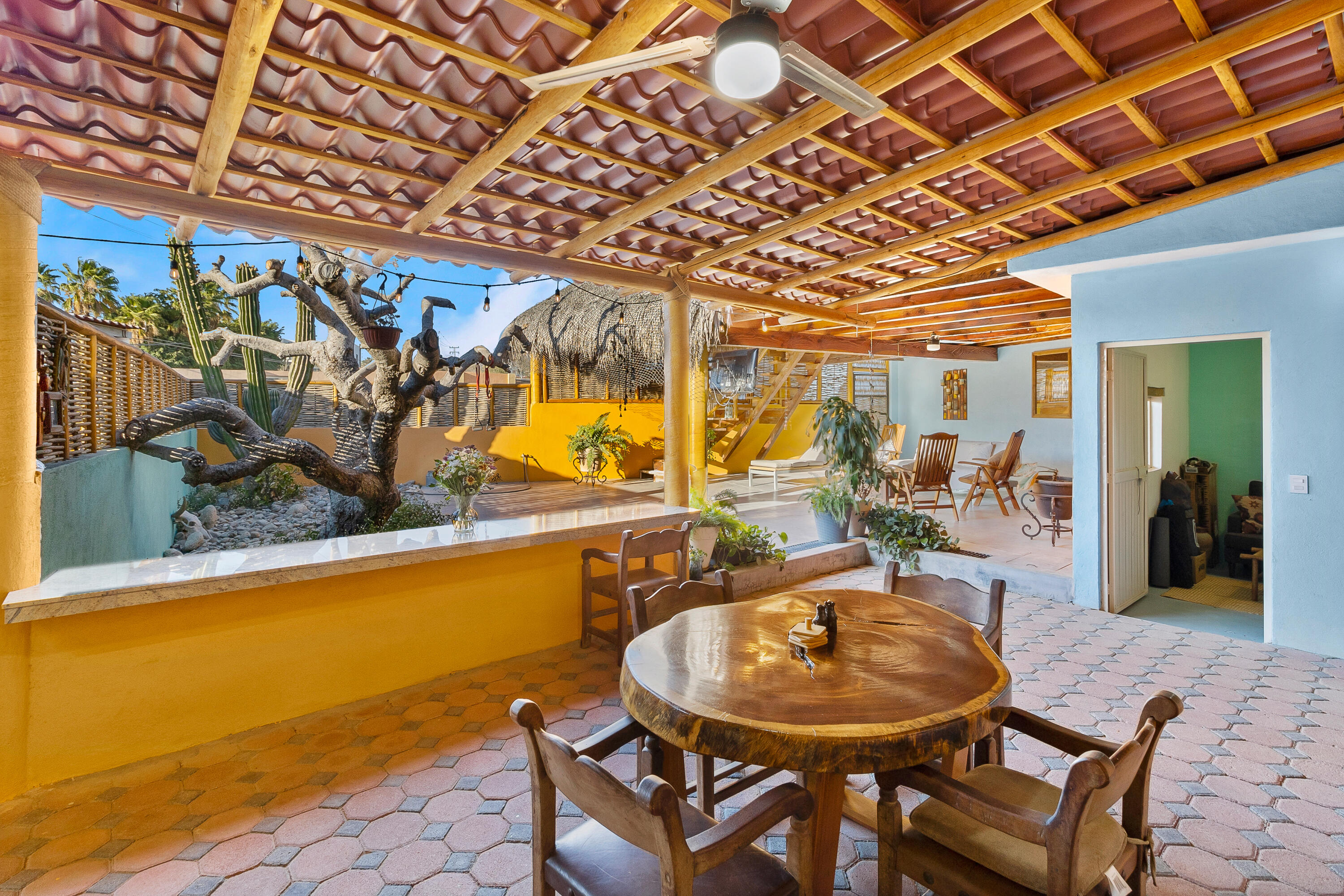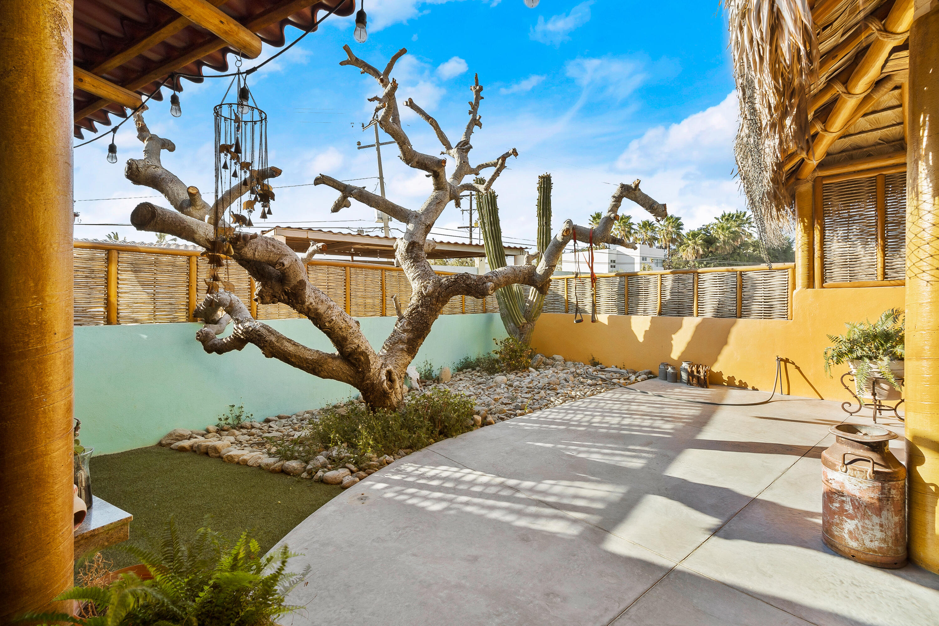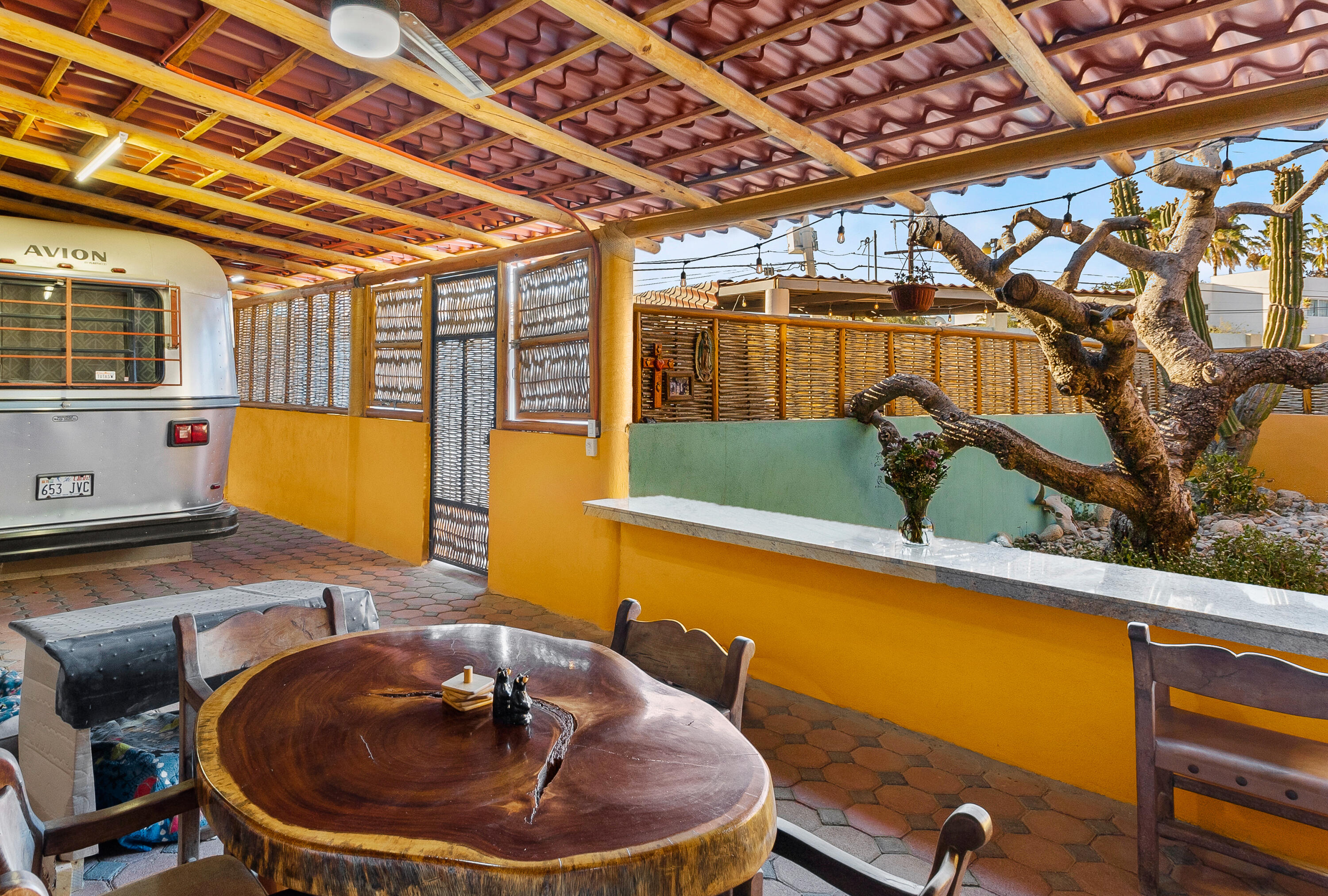 This 7739.78 square feet corner lot, The Cabo Bungalow Escape, is one-of-a-kind Bohemian bungalow that will blow you away with its unique open floor design. The Cabo Bungalow Escape is situated in the lovely, breezy community of El Tezal, Cabo San Lucas only 3 minutes away from the main road ”Cabo Corridor”. This property features one master bedroom with a half bathroom, and a palapa ceiling providing you a refreshing air flow. As the living room provides a lively open space, it boasts a bar and lounge to keep your guests entertained. Connected with is the lushly landscaped kitchen with a fully functioning vintage stove. This property also has a fantastic studio for all of your creative needs. Next to the kitchen there is a 10 meter long Avion RV with another bedroom and living room.