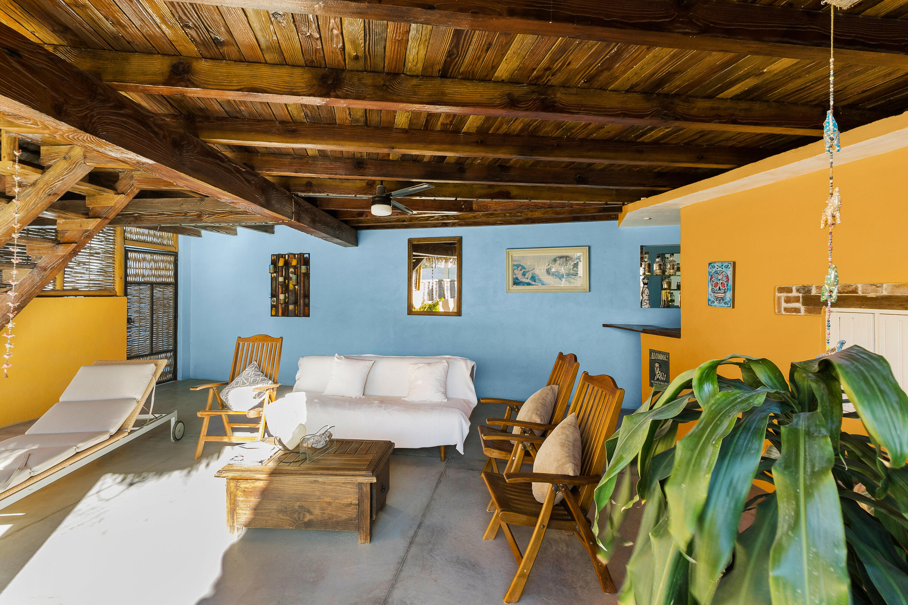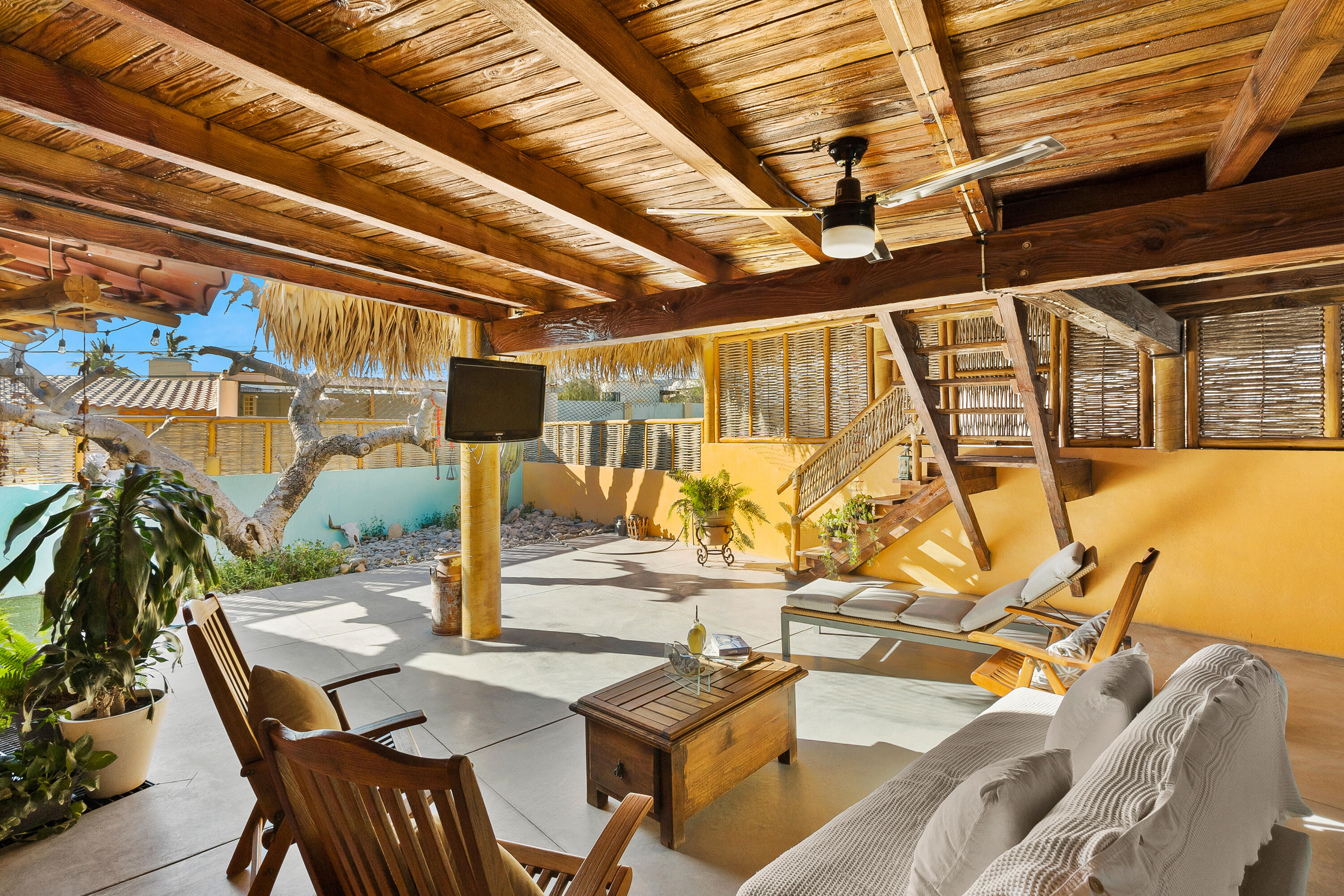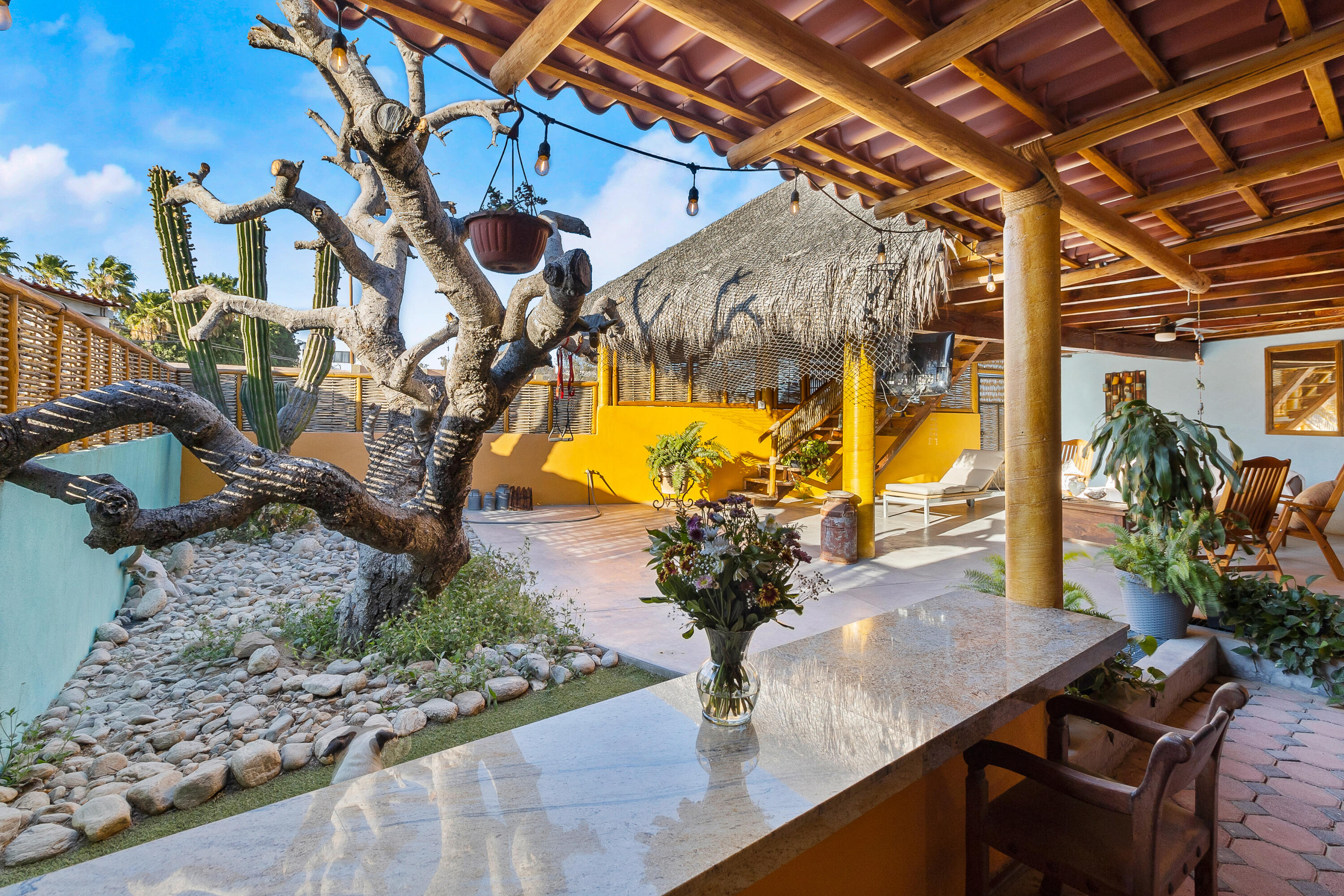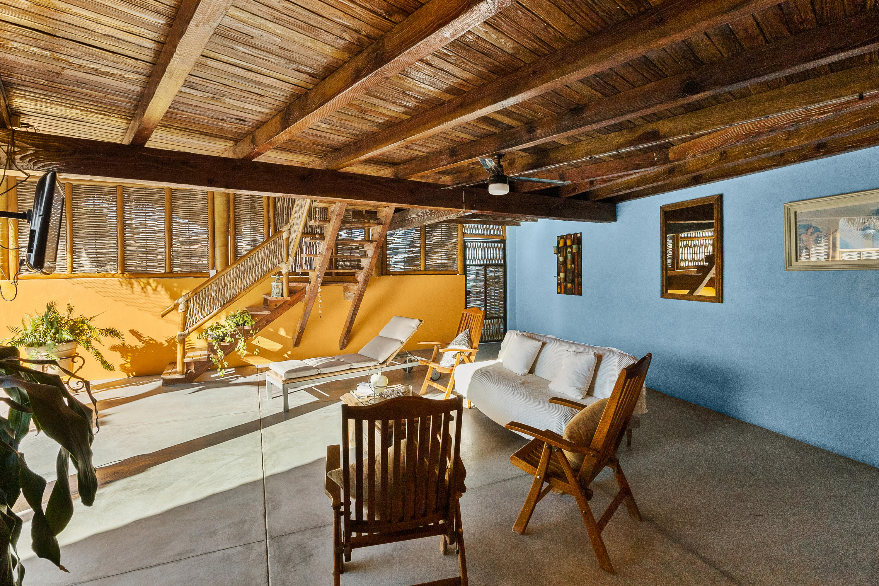 This 7739.78 square feet corner lot, The Cabo Bungalow Escape, is one-of-a-kind Bohemian bungalow that will blow you away with its unique open floor design. The Cabo Bungalow Escape is situated in the lovely, breezy community of El Tezal, Cabo San Lucas only 3 minutes away from the main road ”Cabo Corridor”. This property features one master bedroom with a half bathroom, and a palapa ceiling providing you a refreshing air flow. As the living room provides a lively open space, it boasts a bar and lounge to keep your guests entertained. Connected with is the lushly landscaped kitchen with a fully functioning vintage stove. This property also has a fantastic studio for all of your creative needs. Next to the kitchen there is a 10 meter long Avion RV with another bedroom and living room.