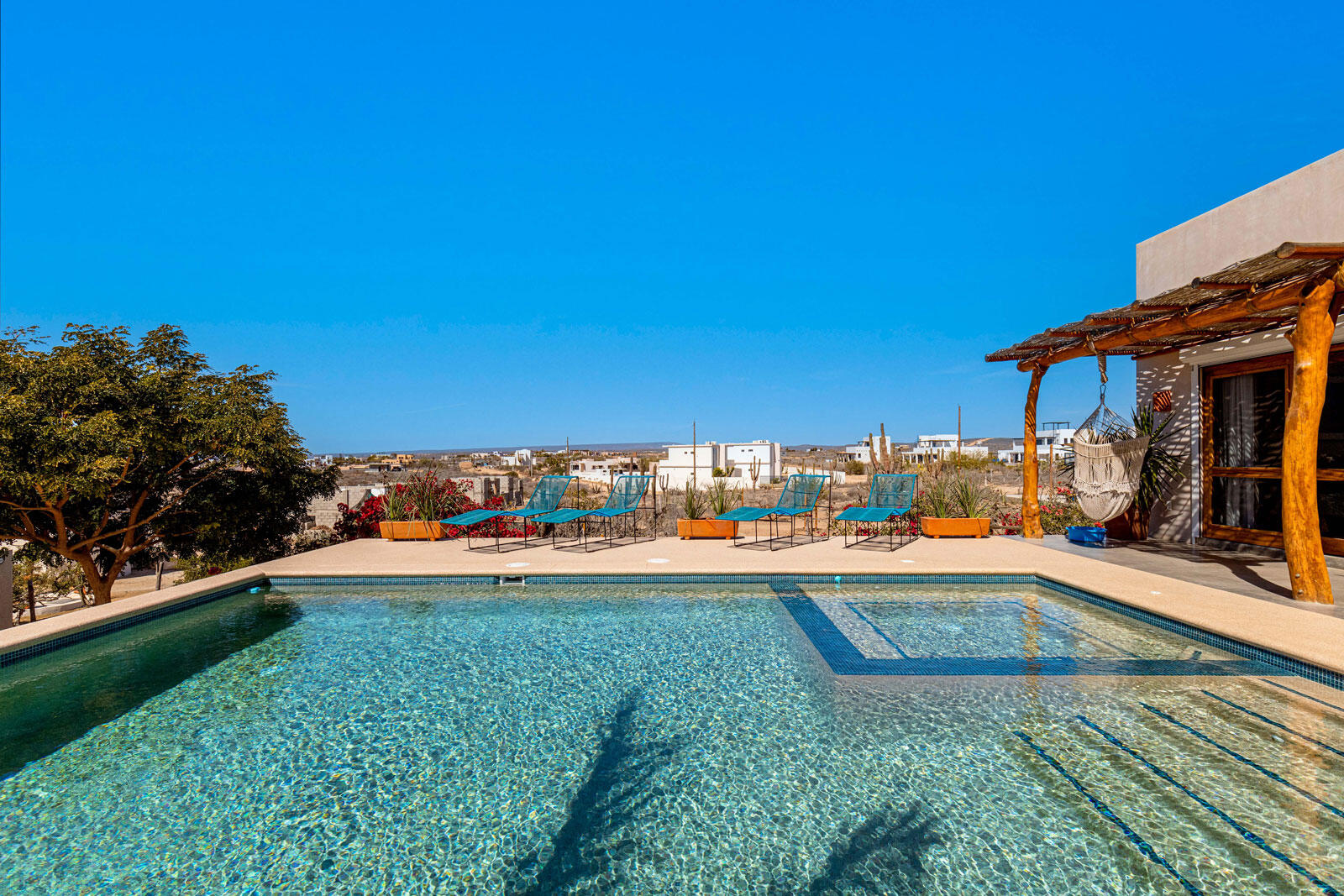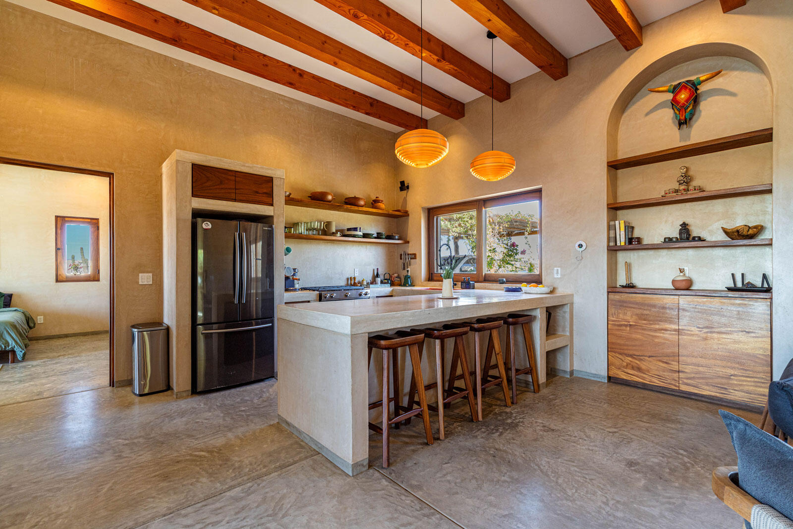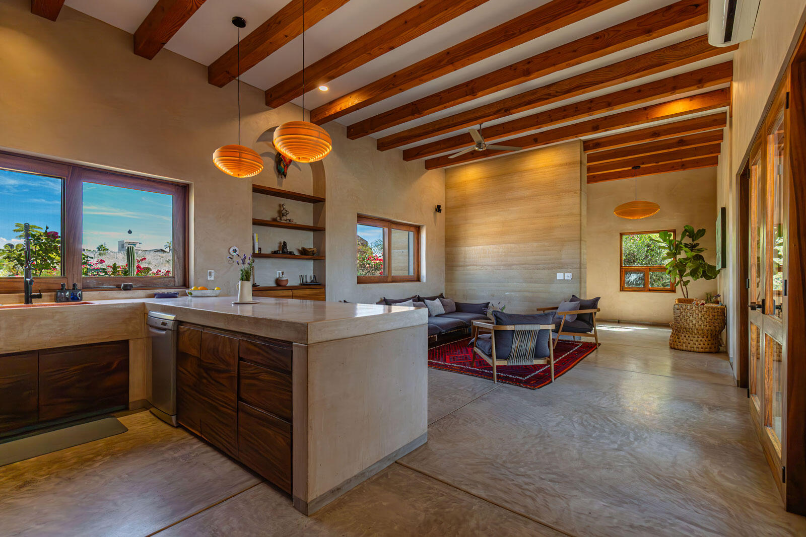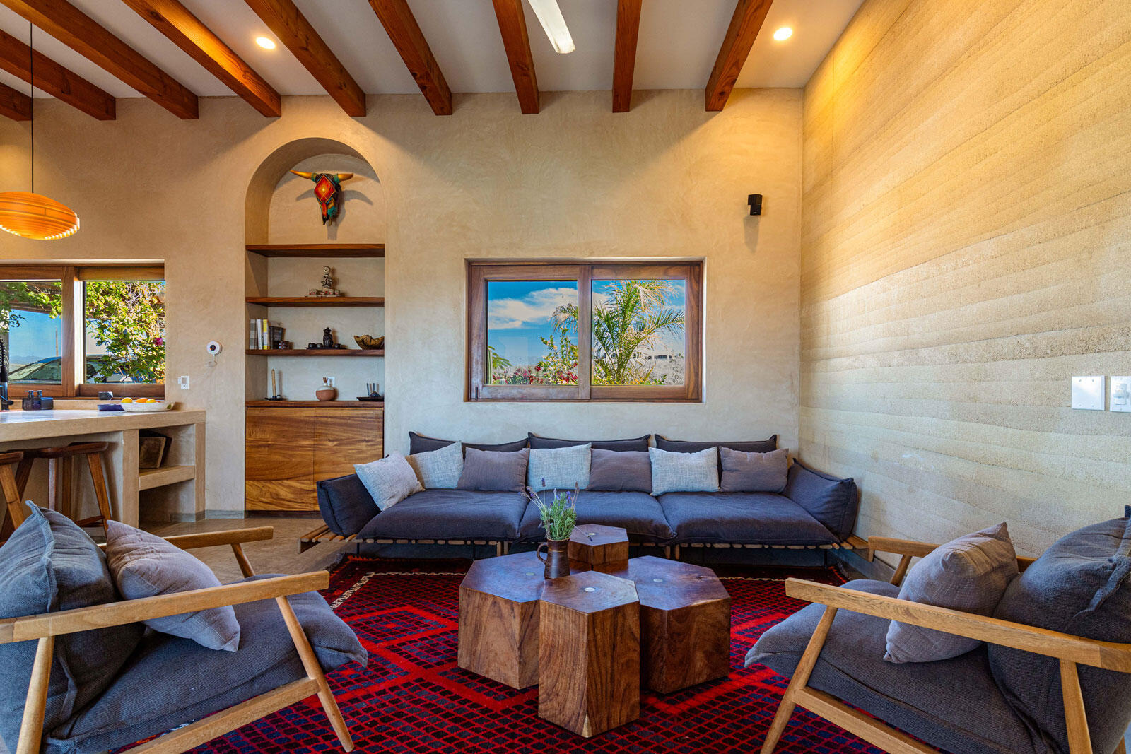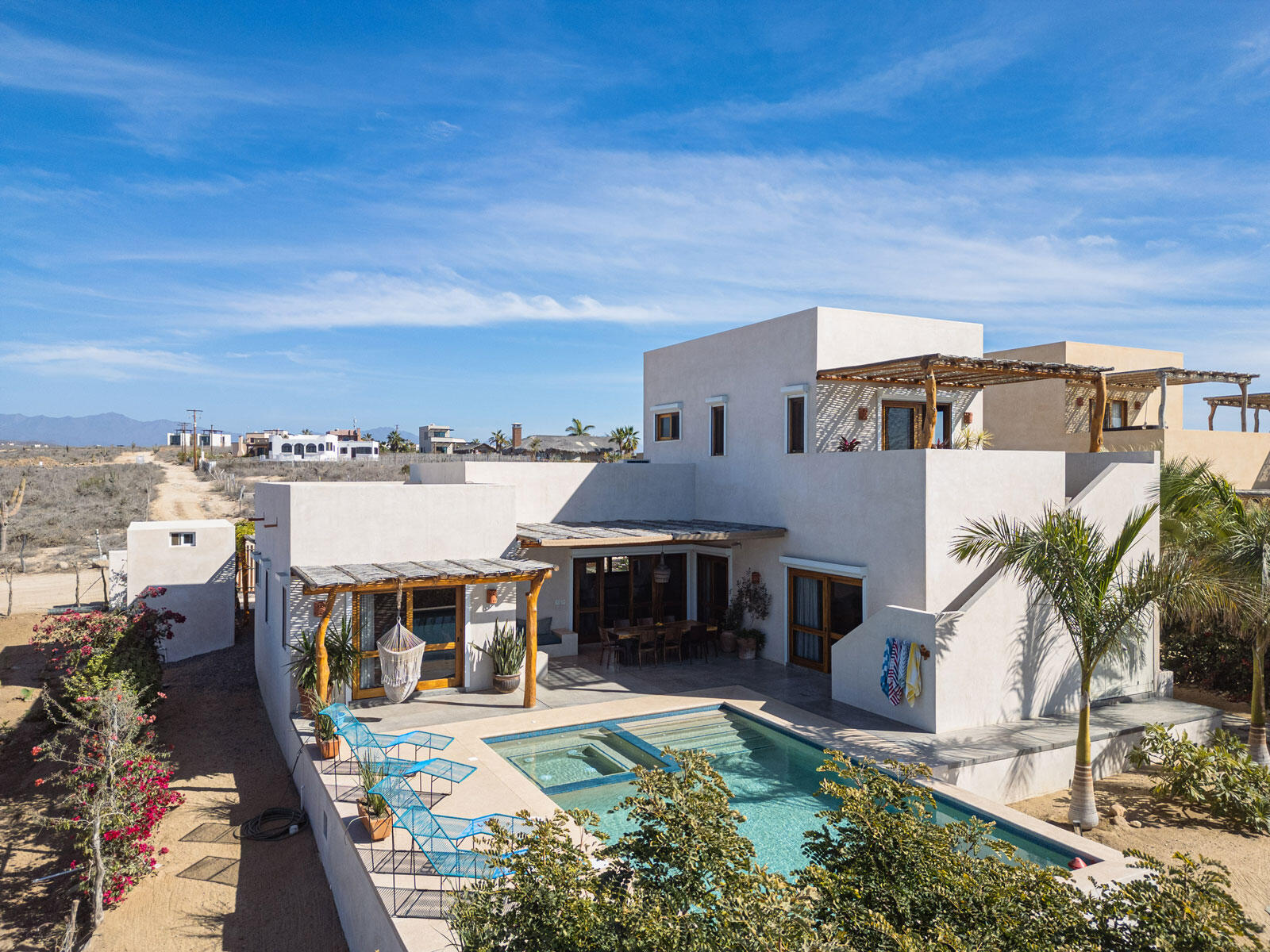 A luxury retreat built by Casa Baja, fully furnished by Casa de Todos, and ready to move in or rent! This 3-bed, 3.5-bath home features soaring wood-beamed ceilings, custom parota finishes, and a striking rammed earth accent wall. Designed for seamless indoor-outdoor living, it boasts a spacious patio, phantom screens, hurricane shutters, Bose speakers, and lush landscaping with fruit trees. The extra-large saltwater pool, oversized hot tub (electric & propane heat), and outdoor shower complete the oasis. A generator, whole-house water filtration, covered parking, and a secure bodega with a second fridge offer convenience. Option to purchase with adjacent Casita Serenidad for a rare 3,200m compound.