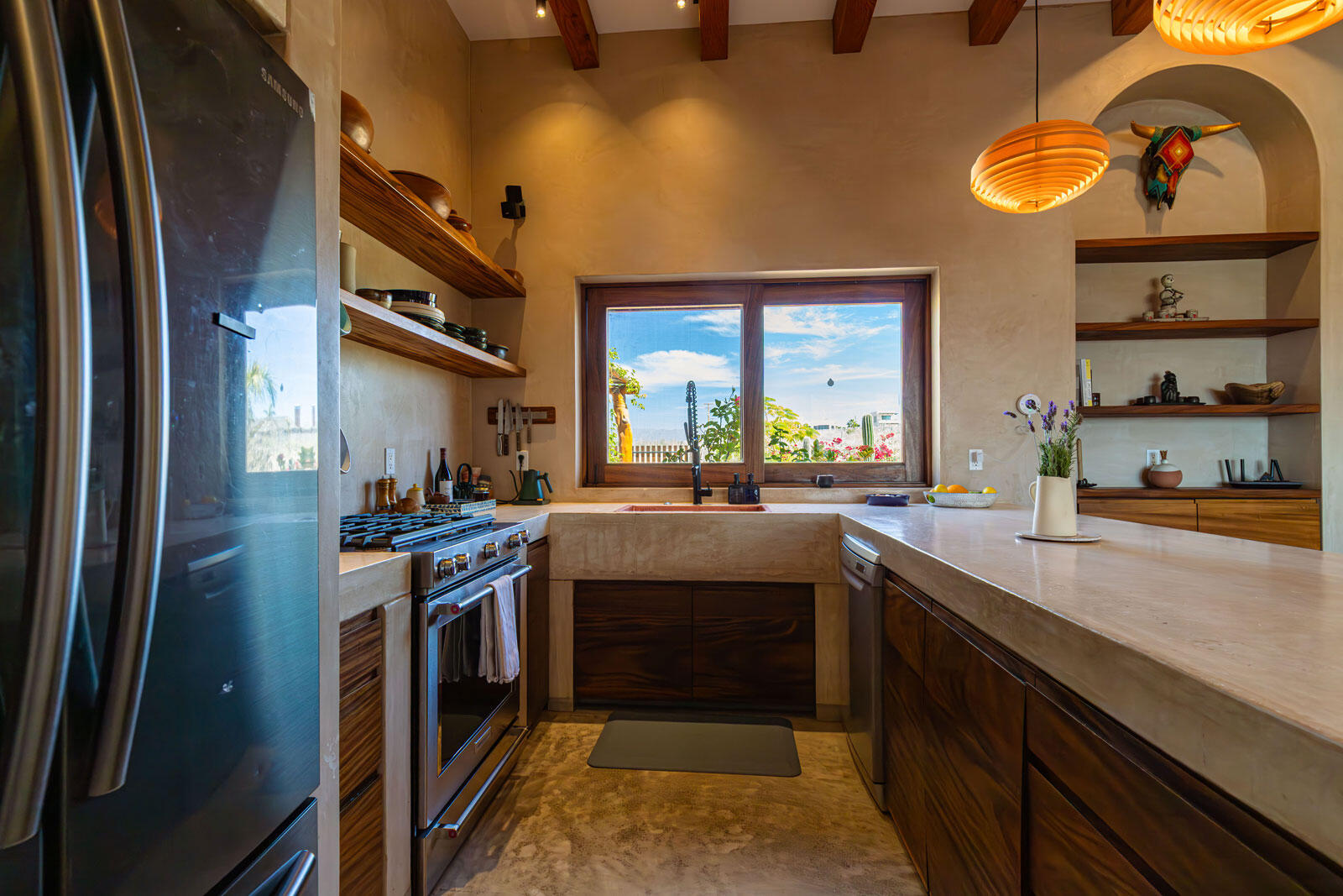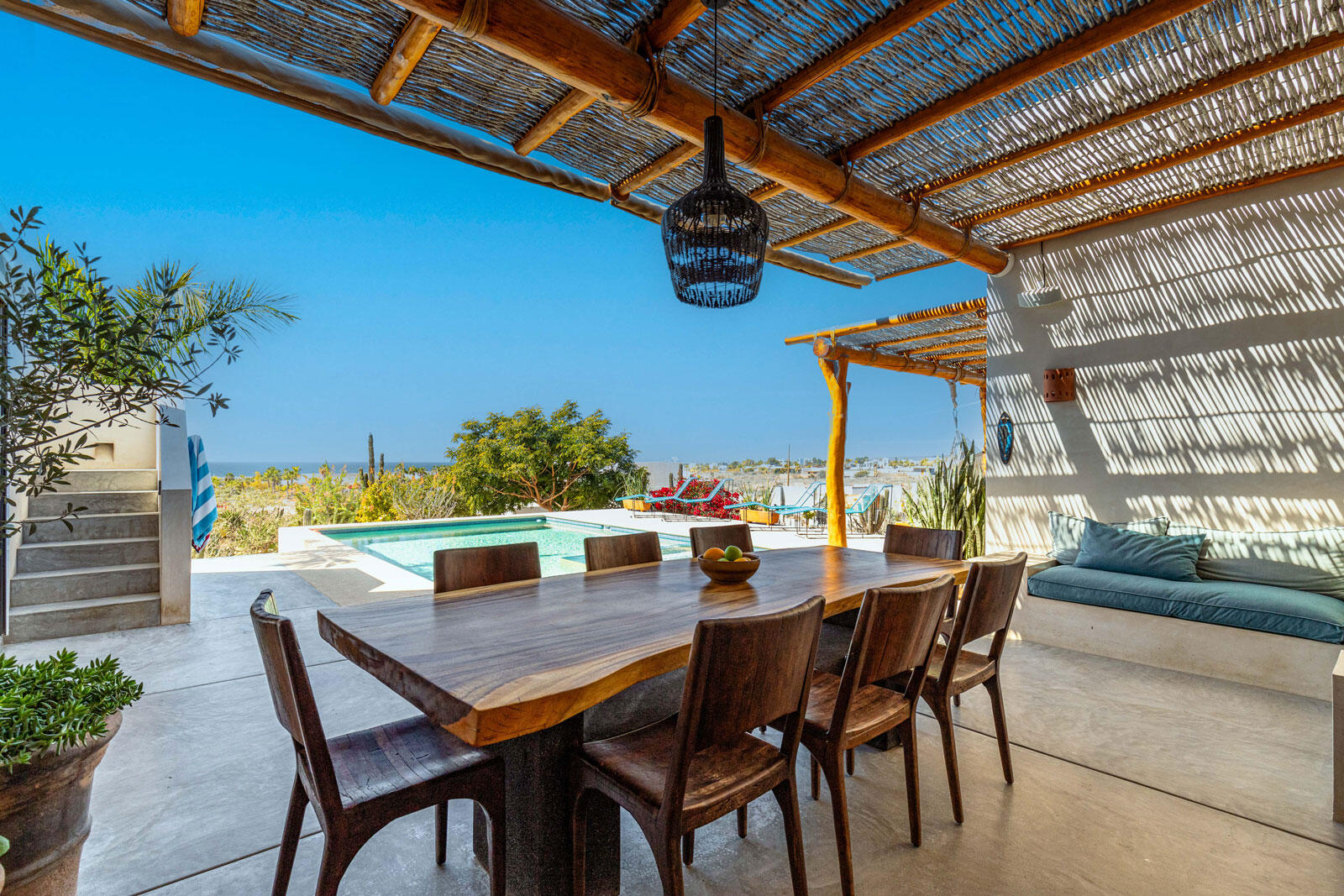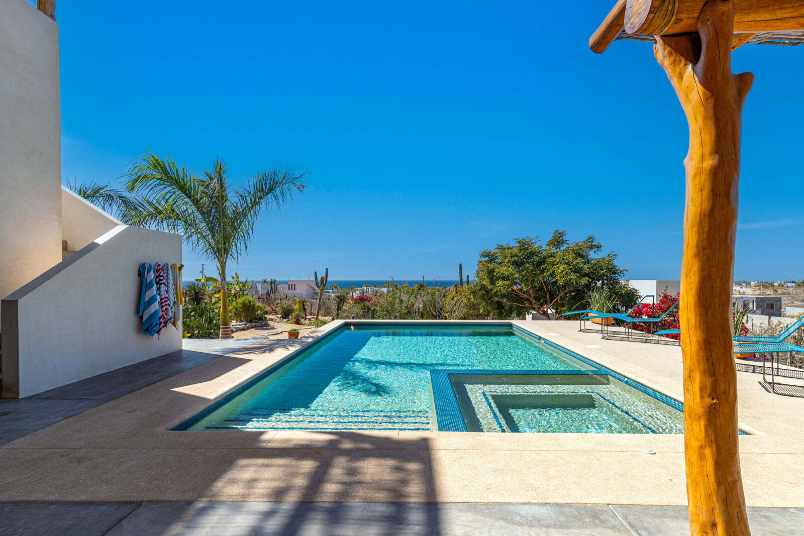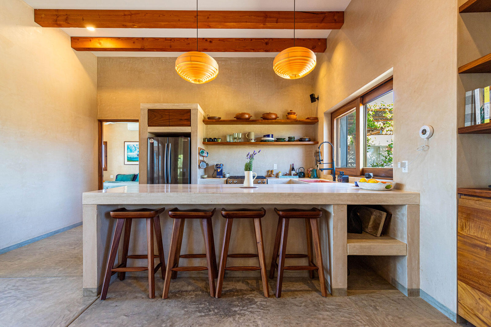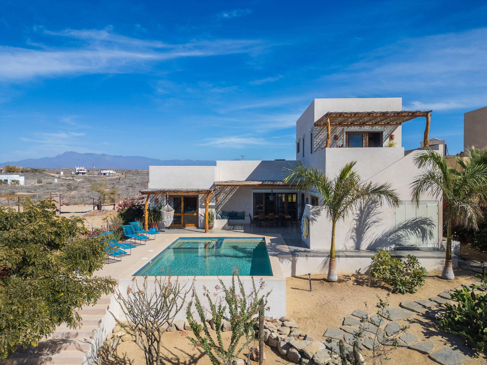 A luxury retreat built by Casa Baja, fully furnished by Casa de Todos, and ready to move in or rent! This 3-bed, 3.5-bath home features soaring wood-beamed ceilings, custom parota finishes, and a striking rammed earth accent wall. Designed for seamless indoor-outdoor living, it boasts a spacious patio, phantom screens, hurricane shutters, Bose speakers, and lush landscaping with fruit trees. The extra-large saltwater pool, oversized hot tub (electric & propane heat), and outdoor shower complete the oasis. A generator, whole-house water filtration, covered parking, and a secure bodega with a second fridge offer convenience. Option to purchase with adjacent Casita Serenidad for a rare 3,200m compound.