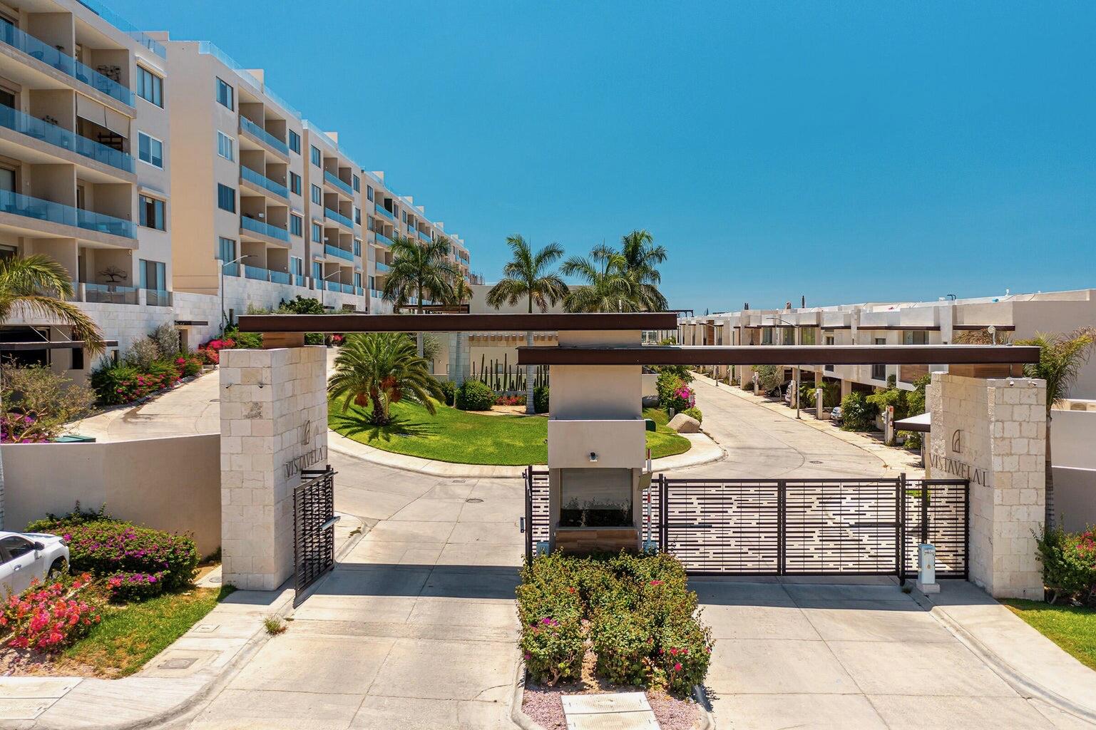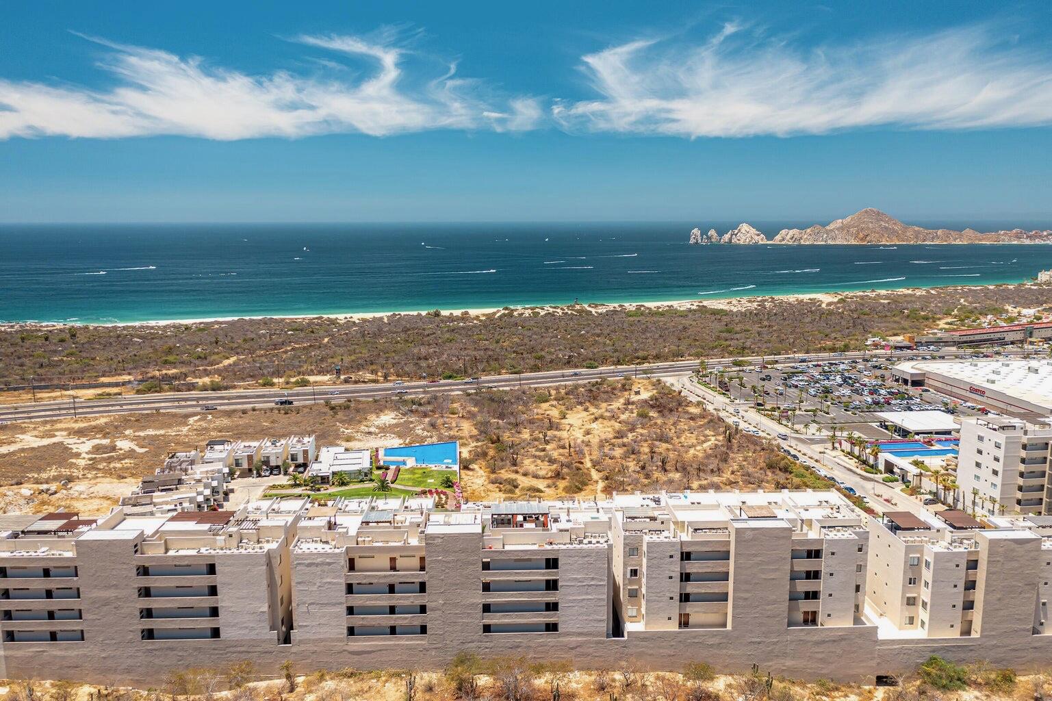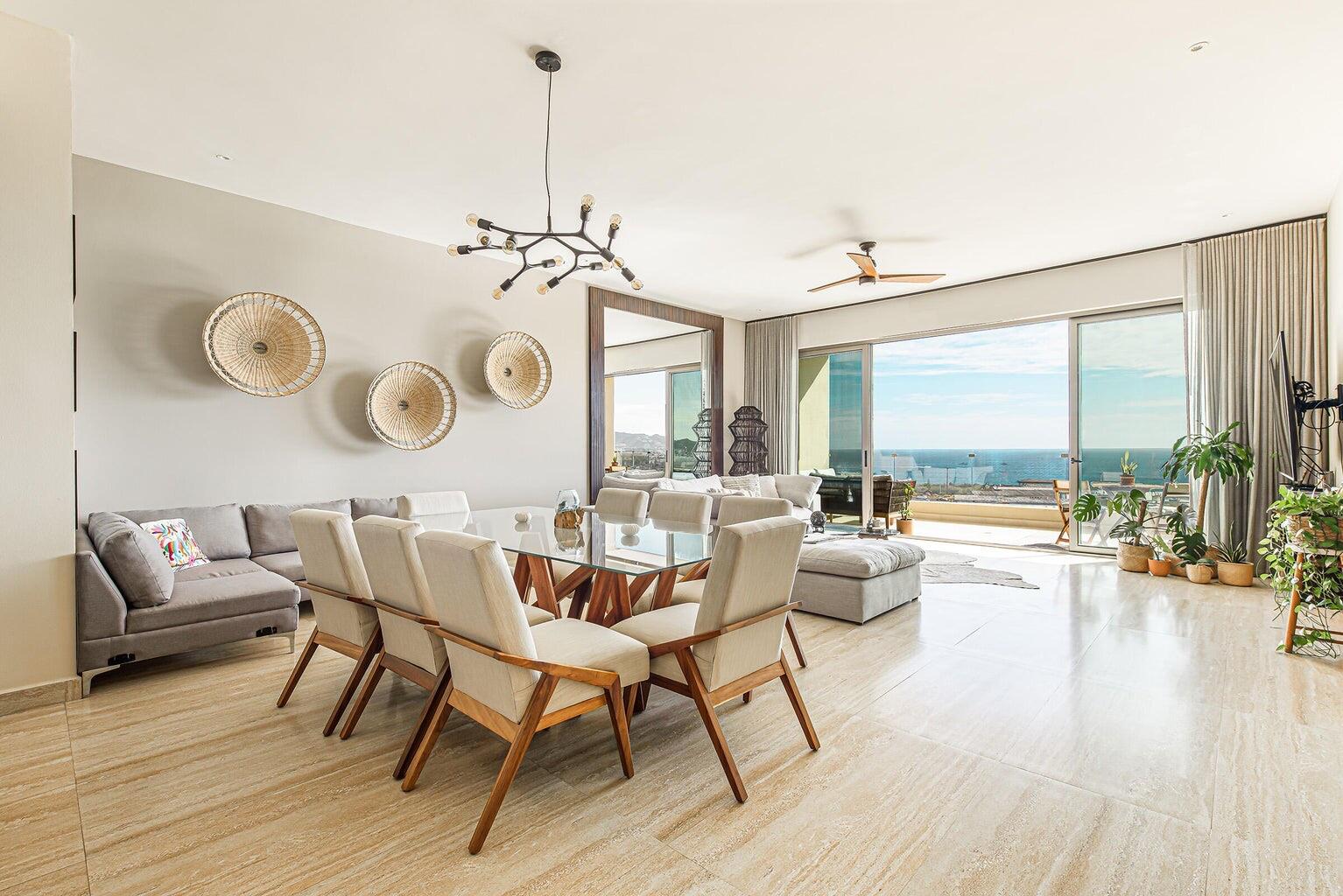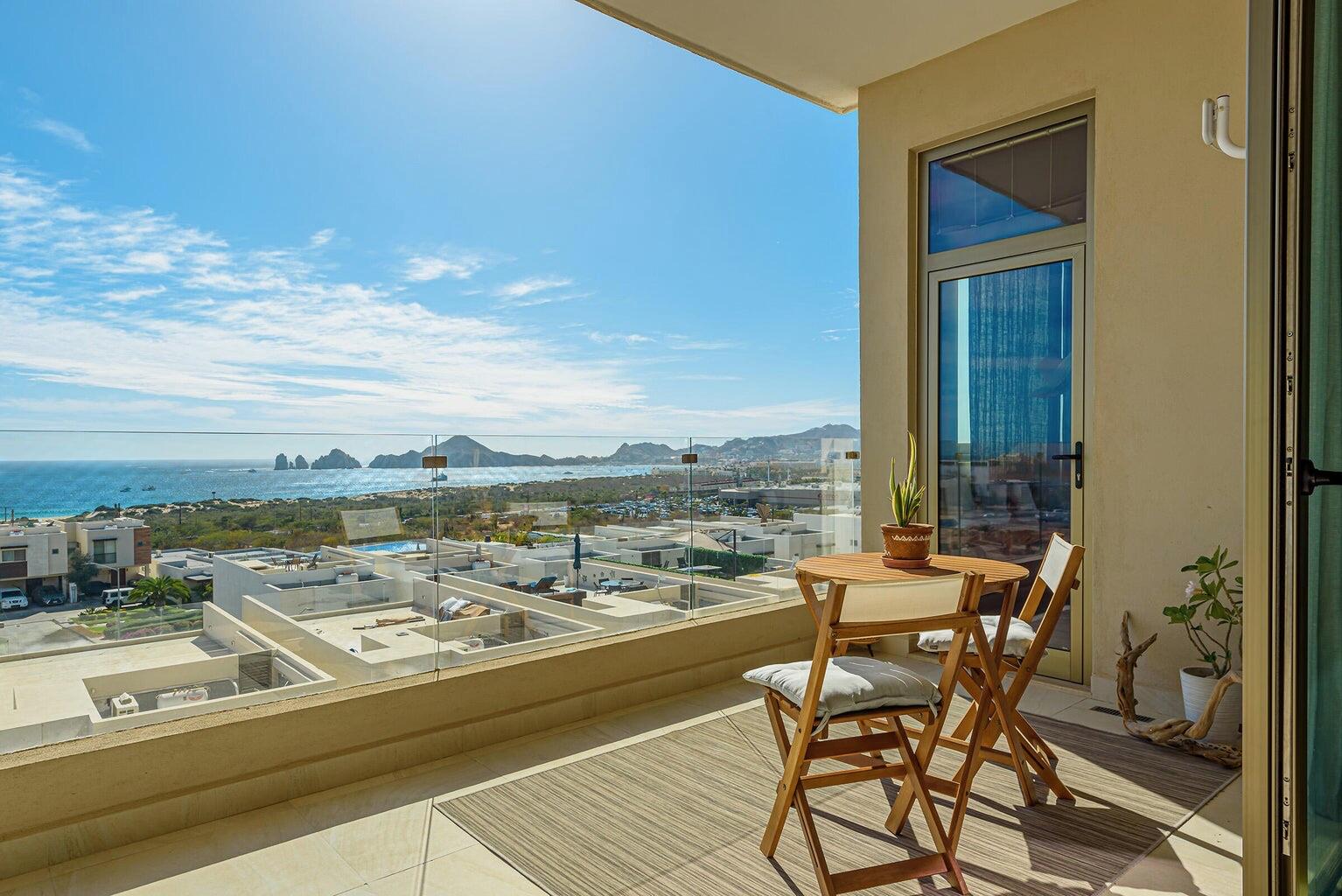 Enjoy stunning ocean views of the Sea of Cortez and Land’s End from this luxury 3-bedroom, 3-bath condo featuring high ceilings and a modern open-concept design. This professionally decorated, turnkey residence is ideally located next to Costco in Vista Vela I. Bright living and dining areas open through floor-to-ceiling sliding doors to a spacious terrace perfect for relaxing or entertaining. The primary suite offers ocean views, a walk-in closet, double vanities, and an ensuite bath. Guest bedrooms include one queen and two twins convertible to a king, both with large closets and ensuite bathrooms. Very private unit and one of the few that includes two covered parking spaces.