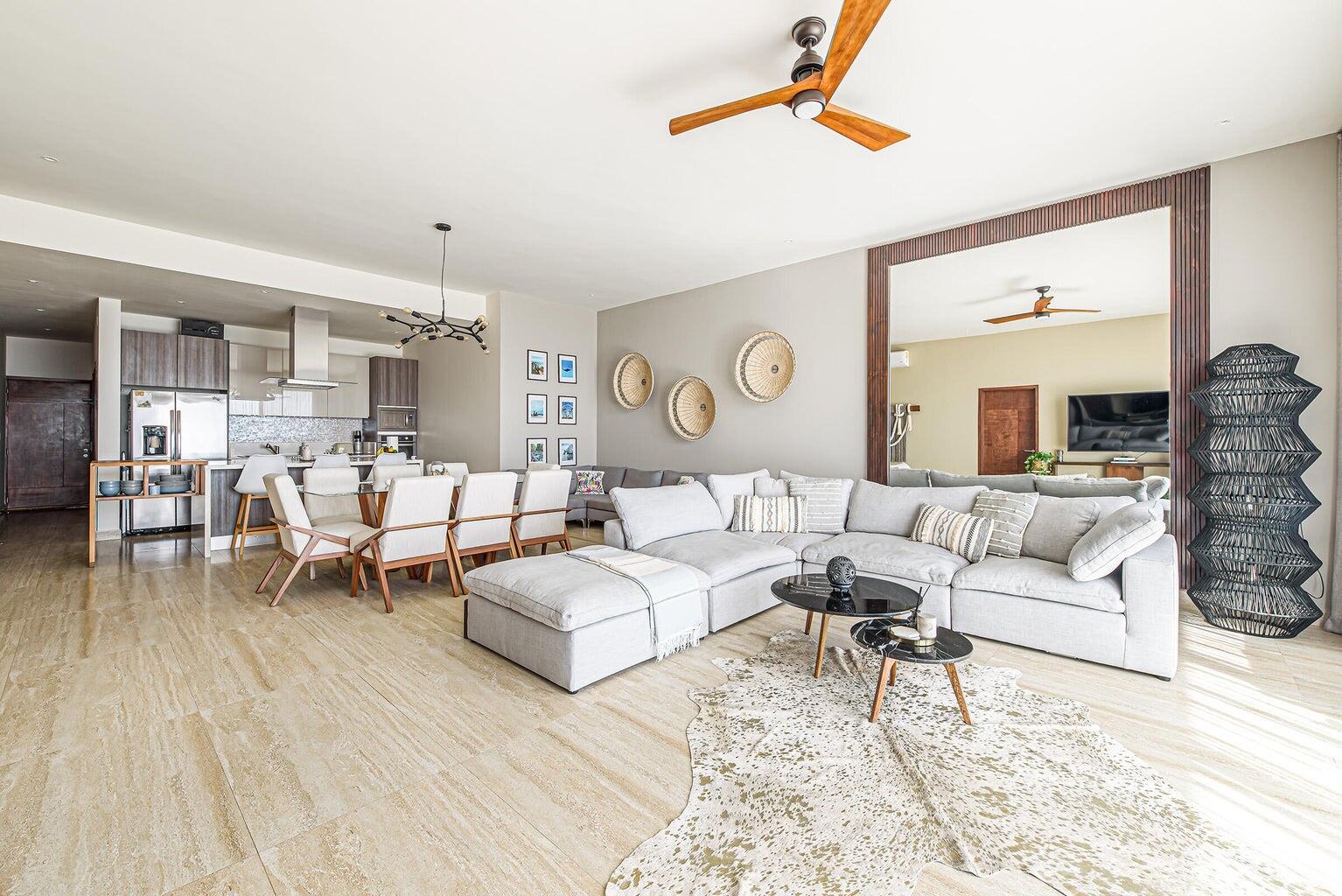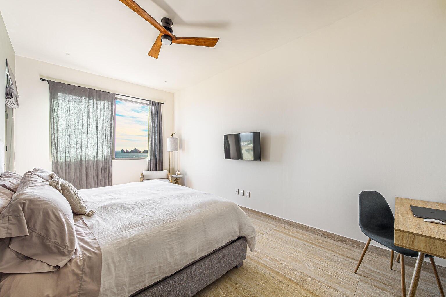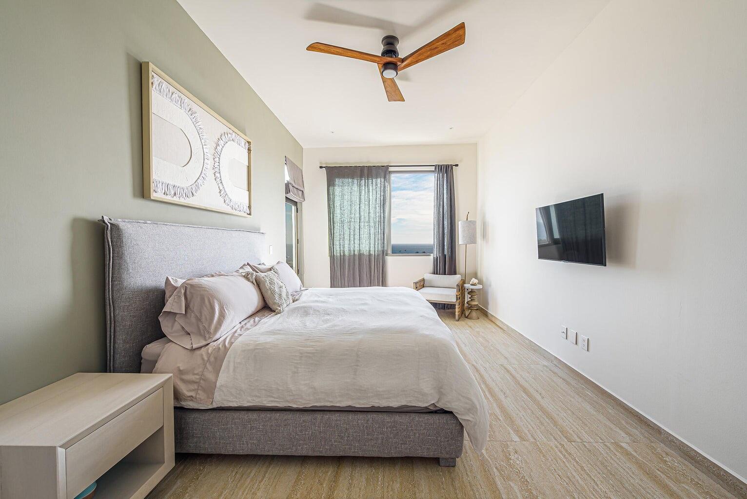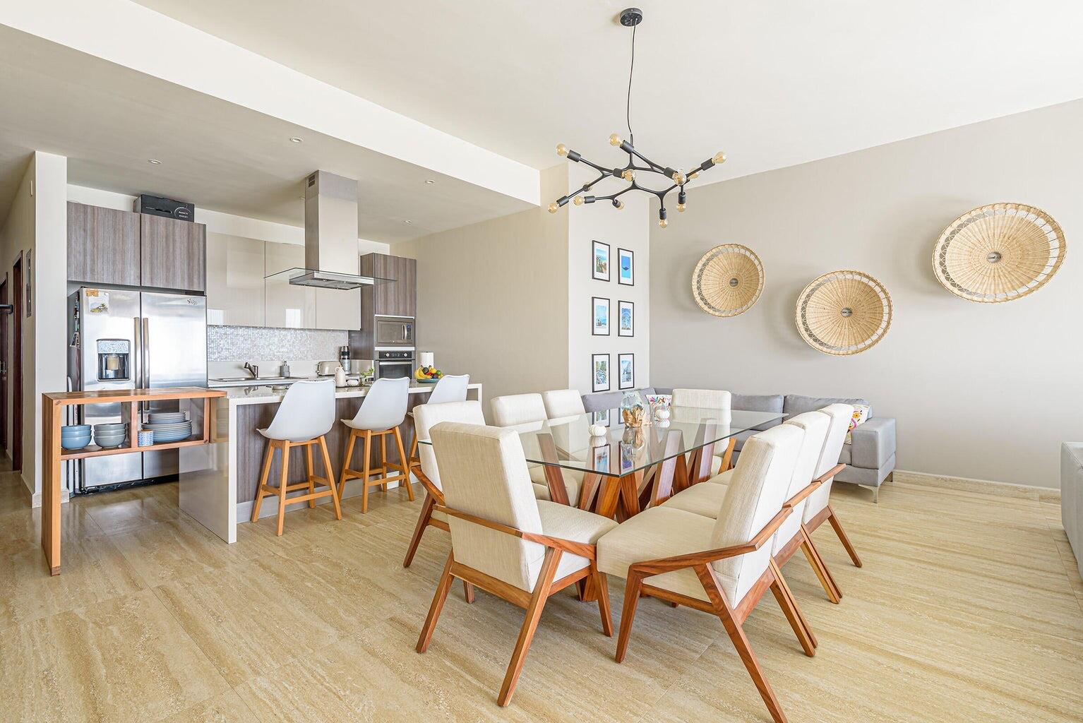 Enjoy stunning ocean views of the Sea of Cortez and Land’s End from this luxury 3-bedroom, 3-bath condo featuring high ceilings and a modern open-concept design. This professionally decorated, turnkey residence is ideally located next to Costco in Vista Vela I. Bright living and dining areas open through floor-to-ceiling sliding doors to a spacious terrace perfect for relaxing or entertaining. The primary suite offers ocean views, a walk-in closet, double vanities, and an ensuite bath. Guest bedrooms include one queen and two twins convertible to a king, both with large closets and ensuite bathrooms. Very private unit and one of the few that includes two covered parking spaces.